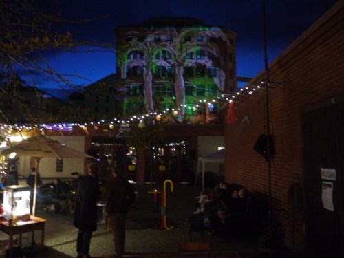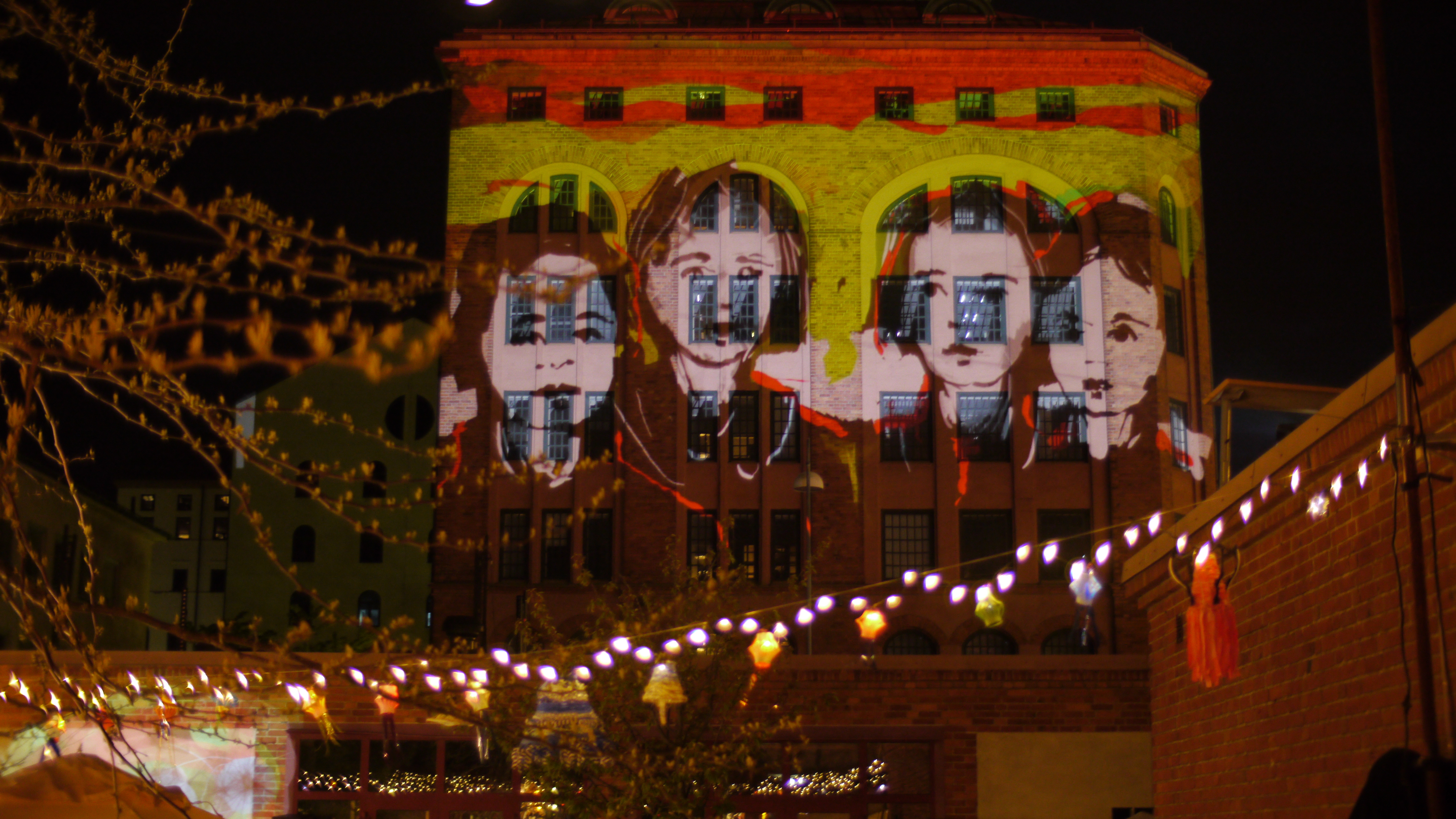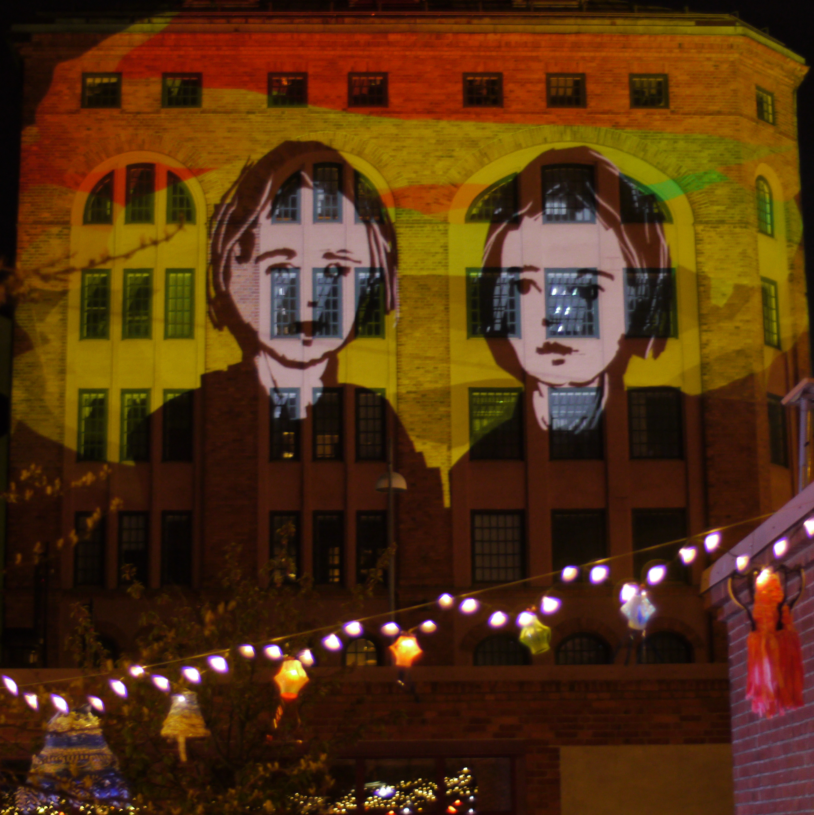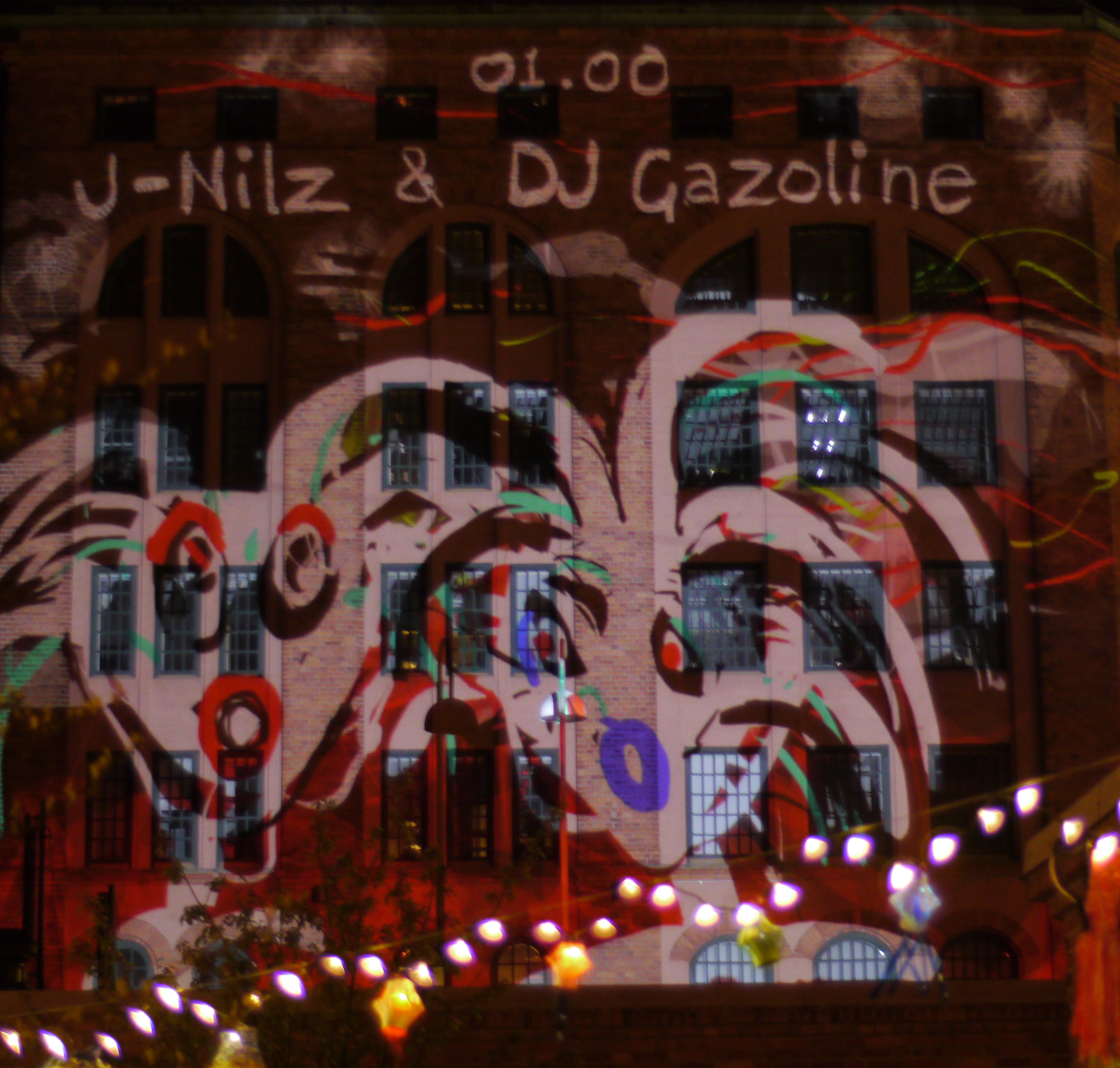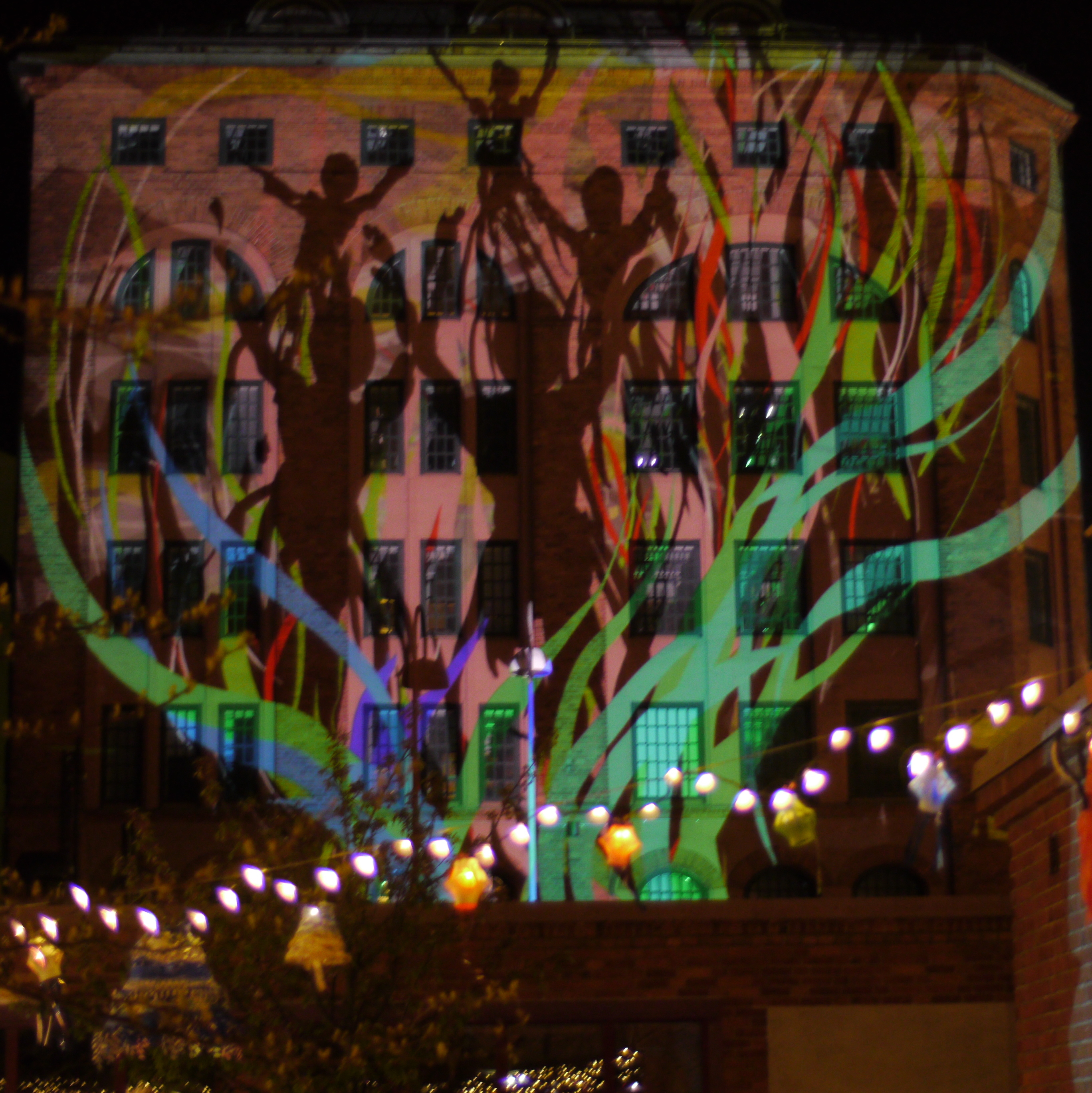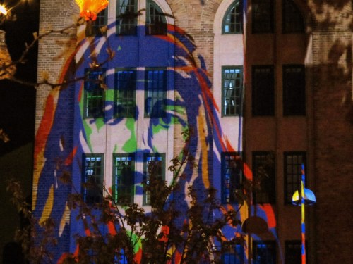 My Tagtool was in the courtyard and I was drawing onto the building overlooking Barbacka – quite a long projection distance. This building presented some quite difficult drawing problems, as the brickwork was dark red and there were lots of windows. However, by prior arrangement, the lighting on the building and street lamp outside had been turned off (which helped a lot) and our big Epson projector gave good clear images, even before it was completely dark. As the photos above show, in the courtyard there was a very festive atmosphere with lots of coloured lanterns which were made by students in the Barbacka workshop.
