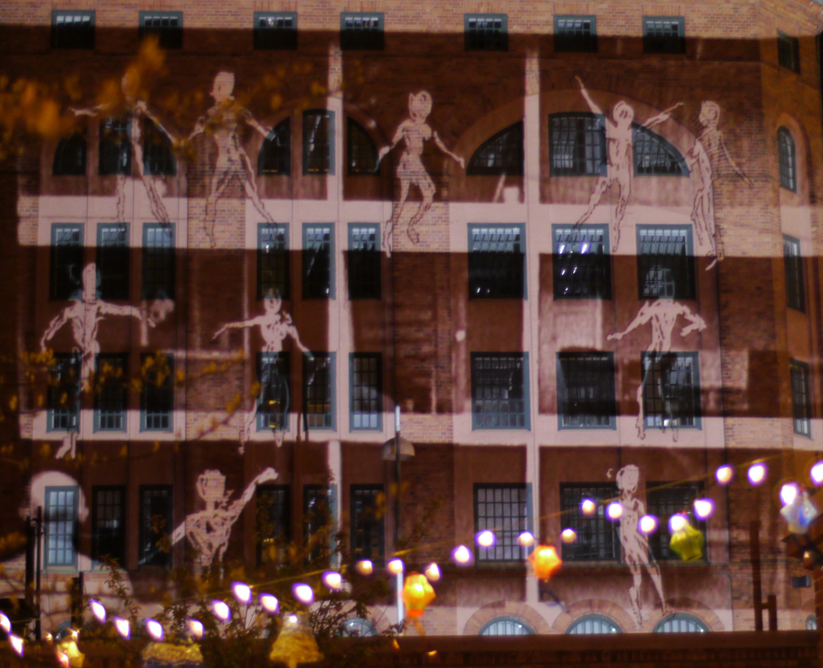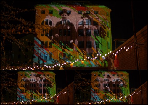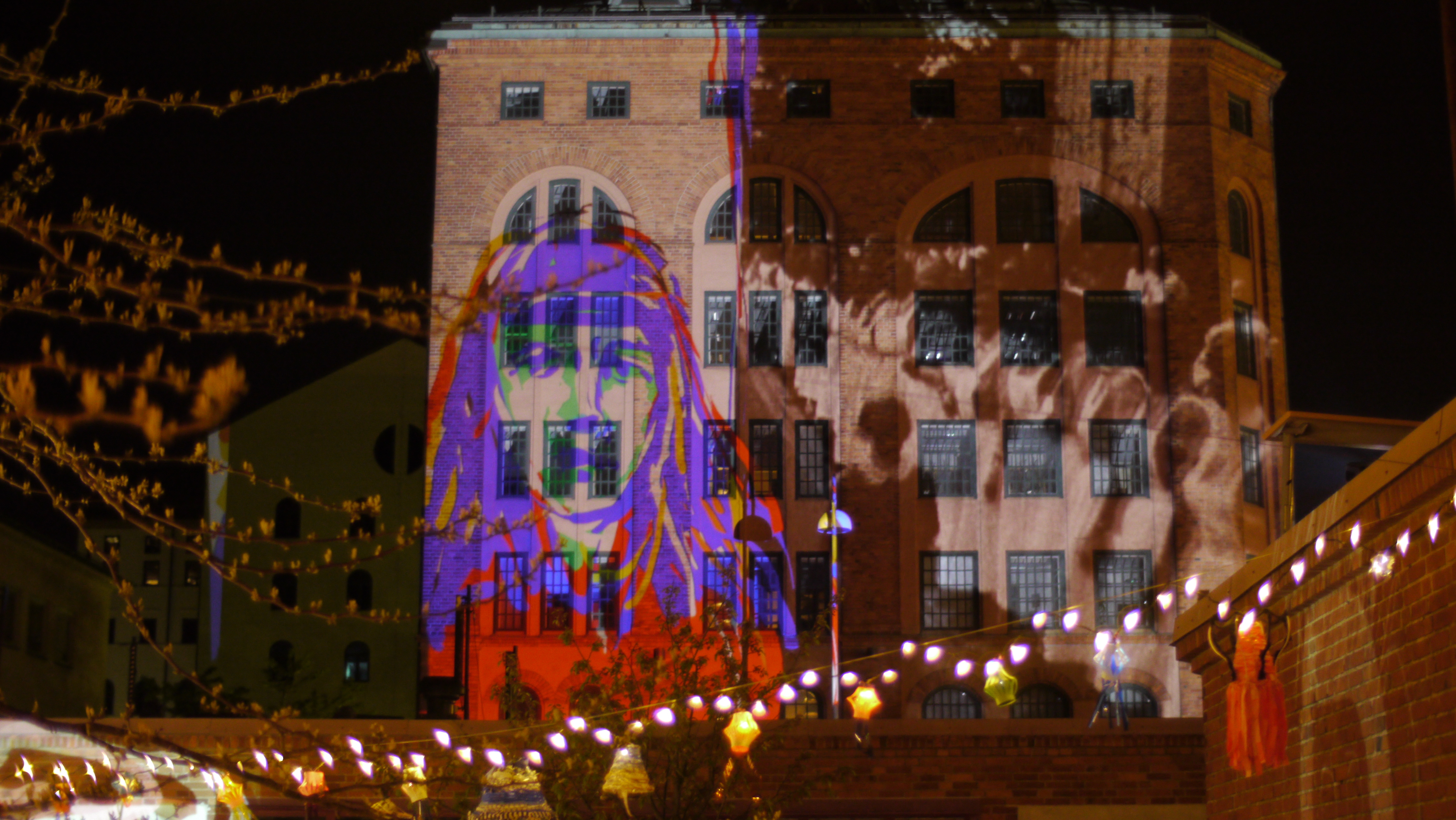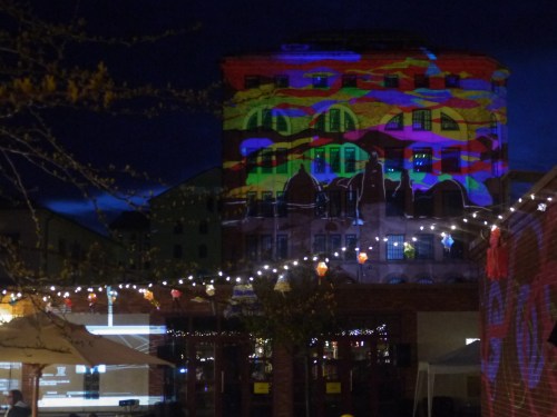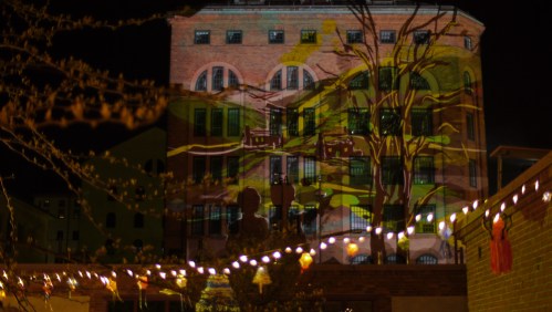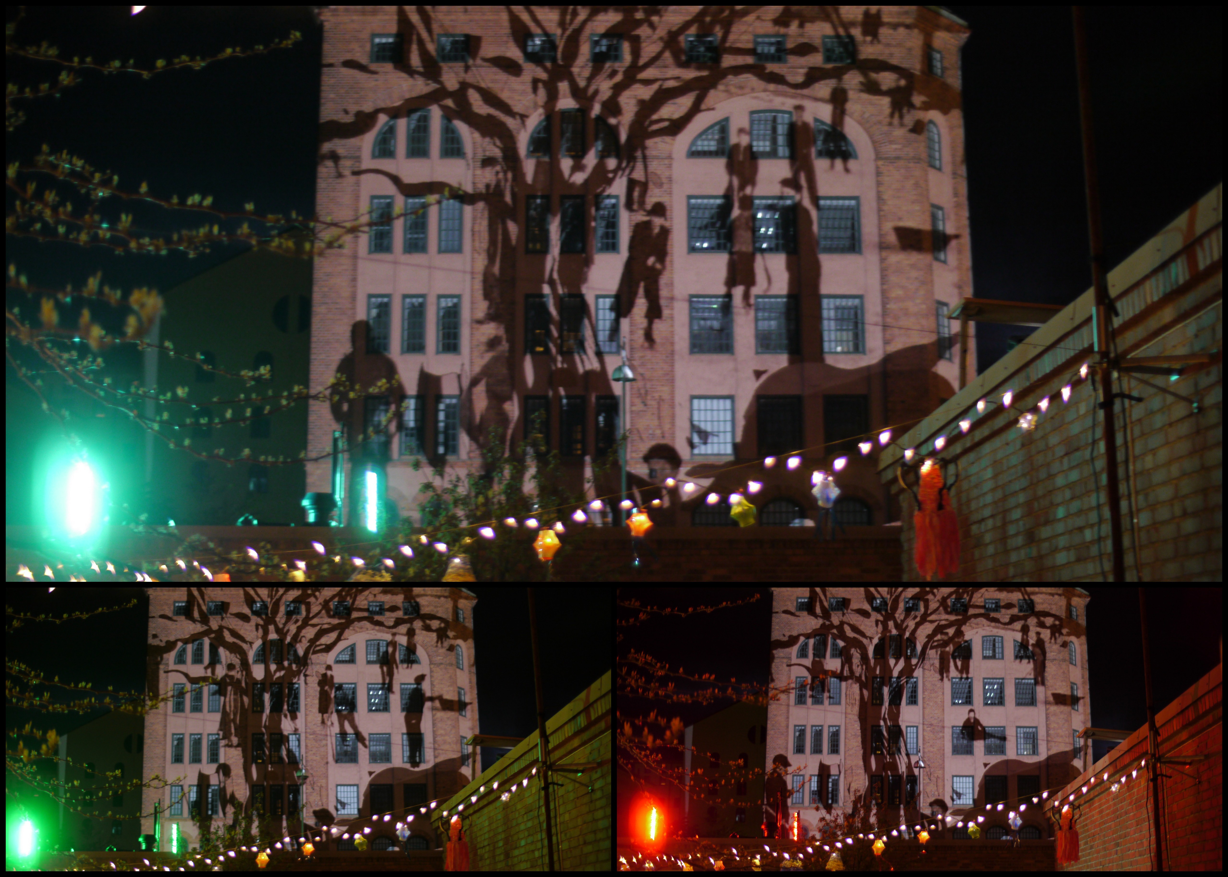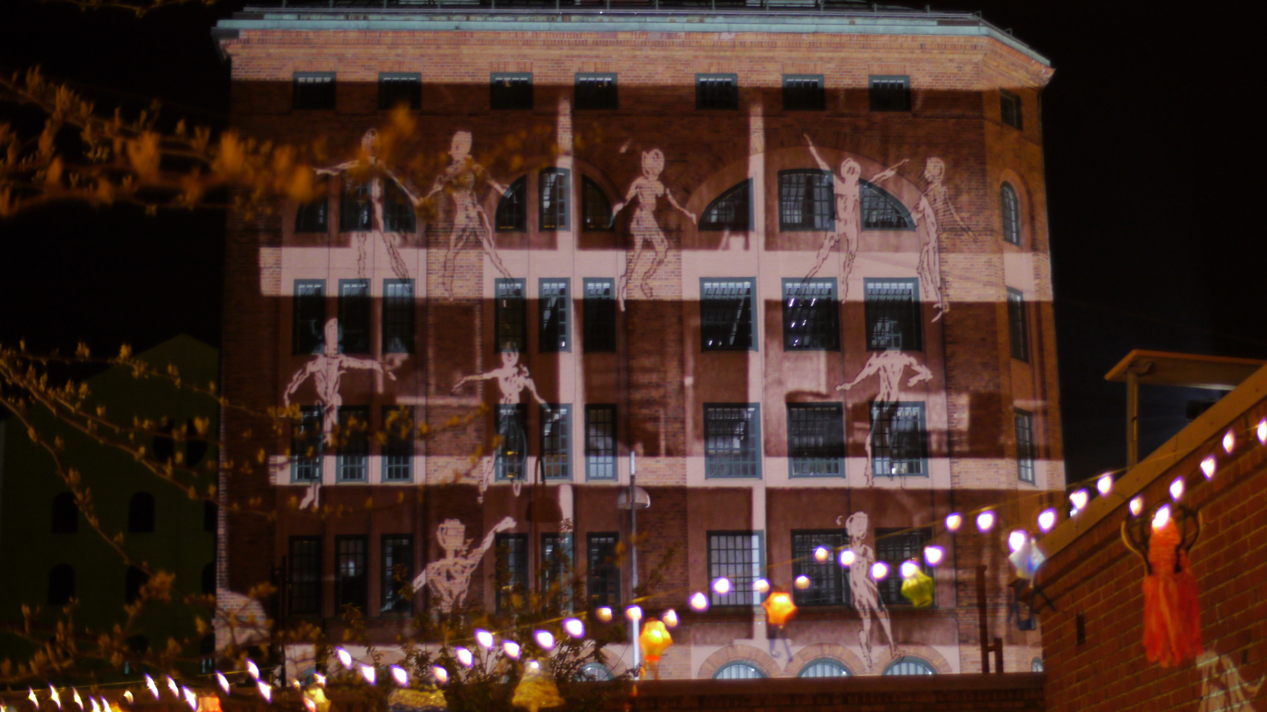 My Tagtool was in the courtyard and I was drawing onto the building overlooking Barbacka – quite a long projection distance. This building presented some quite difficult drawing problems, as the brickwork was dark red and there were lots of windows. However, by prior arrangement, the lighting on the building and street lamp outside had been turned off (which helped a lot) and our big Epson projector gave good clear images, even before it was completely dark. As the photos above show, in the courtyard there was a very festive atmosphere with lots of coloured lanterns which were made by students in the Barbacka workshop.