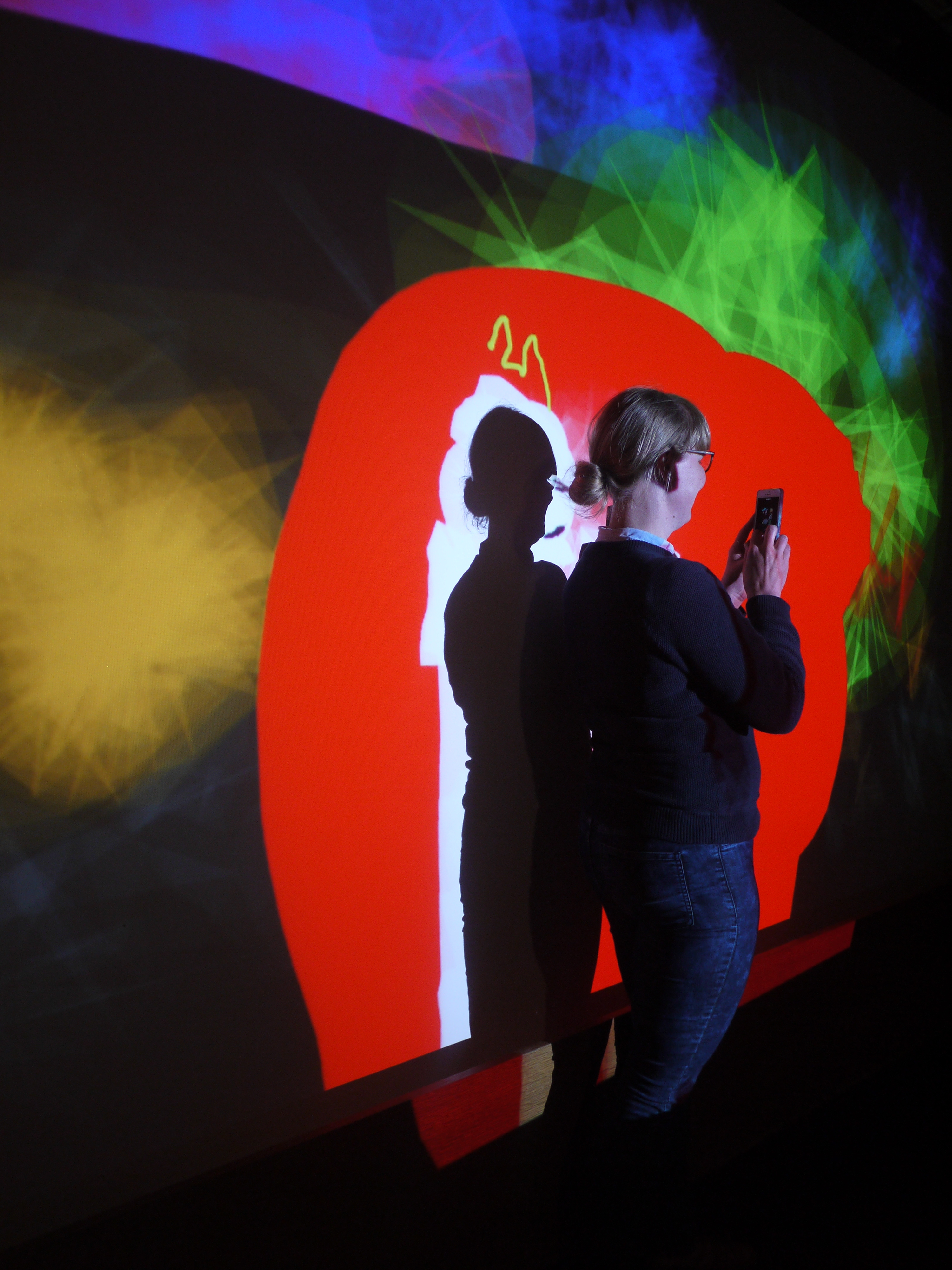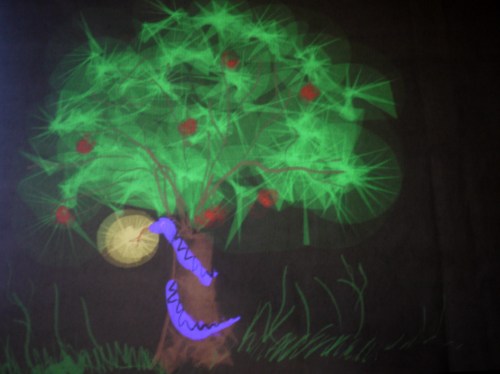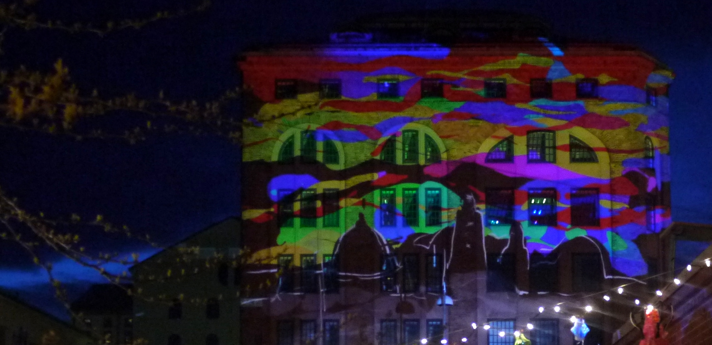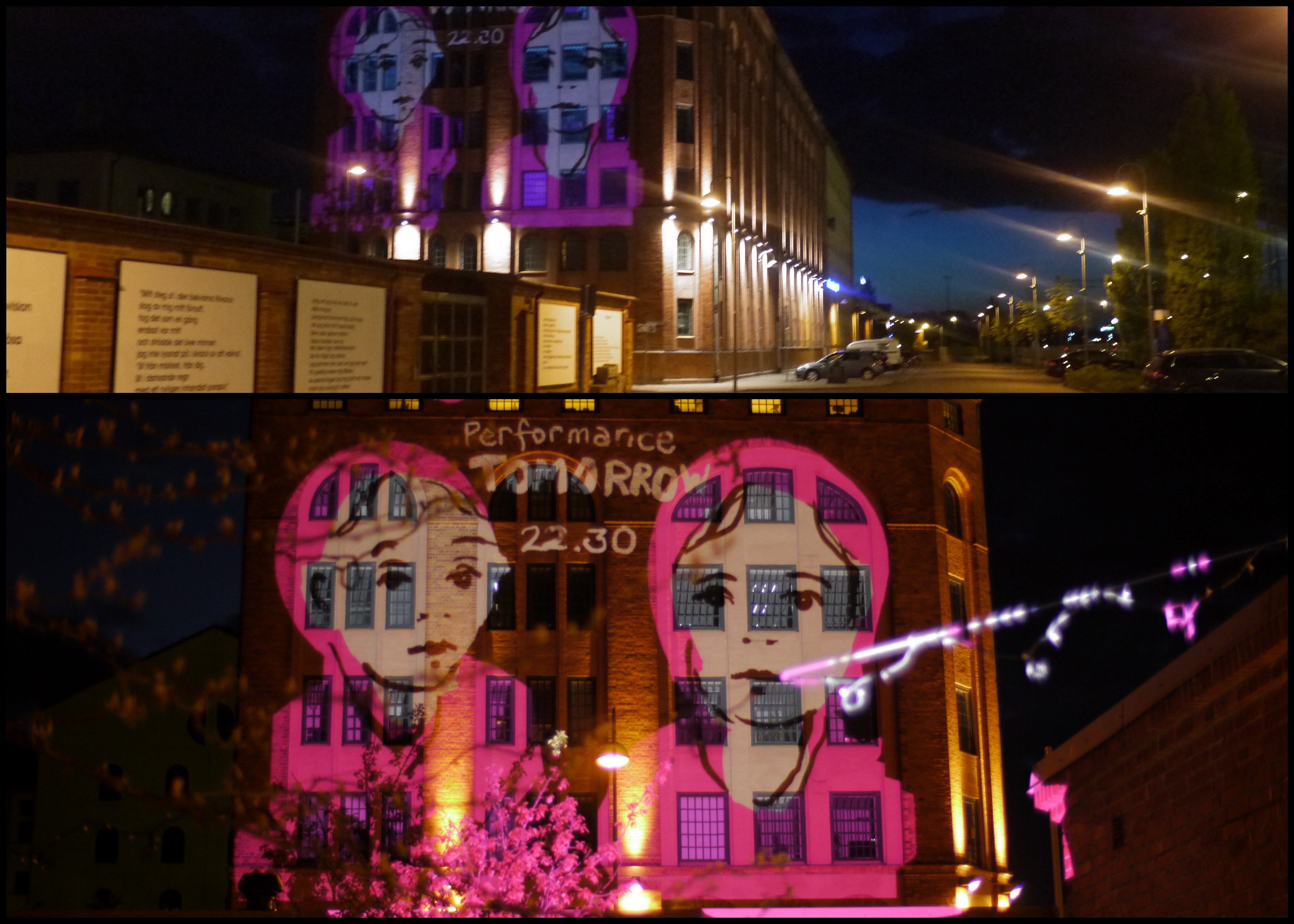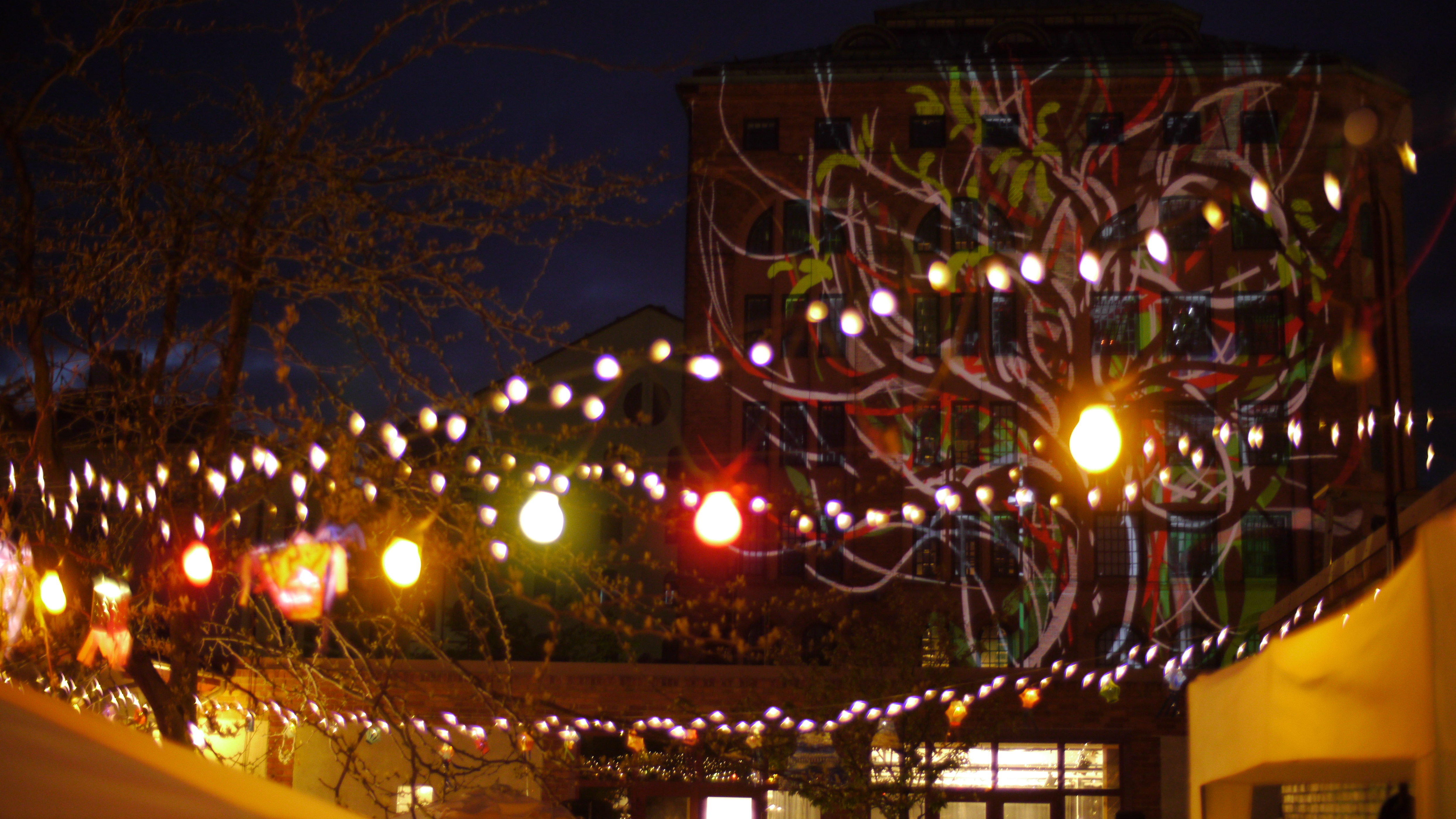 My Tagtool was in the courtyard and I was drawing onto the building overlooking Barbacka – quite a long projection distance. This building presented some quite difficult drawing problems, as the brickwork was dark red and there were lots of windows. However, by prior arrangement, the lighting on the building and street lamp outside had been turned off (which helped a lot) and our big Epson projector gave good clear images, even before it was completely dark. As the photos above show, in the courtyard there was a very festive atmosphere with lots of coloured lanterns which were made by students in the Barbacka workshop.