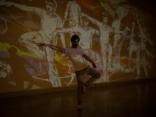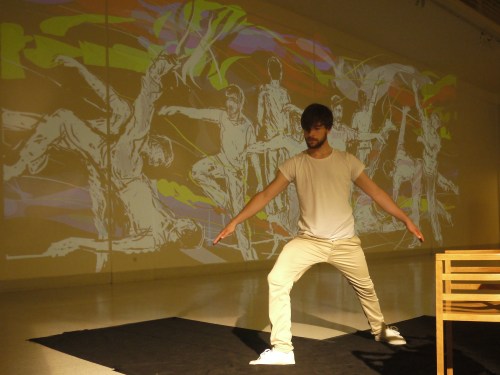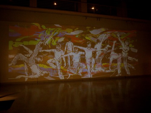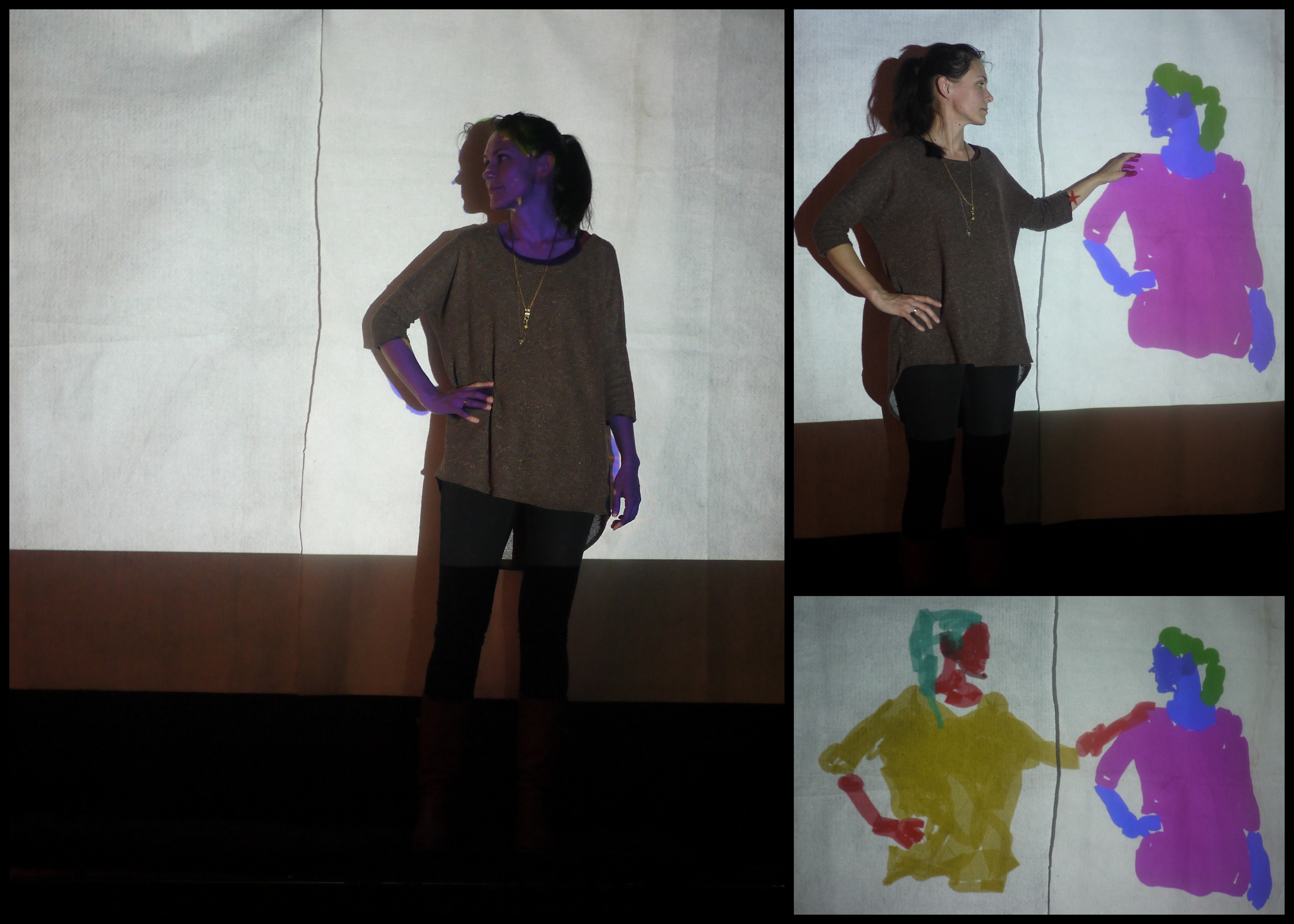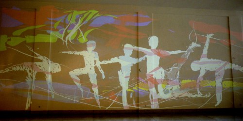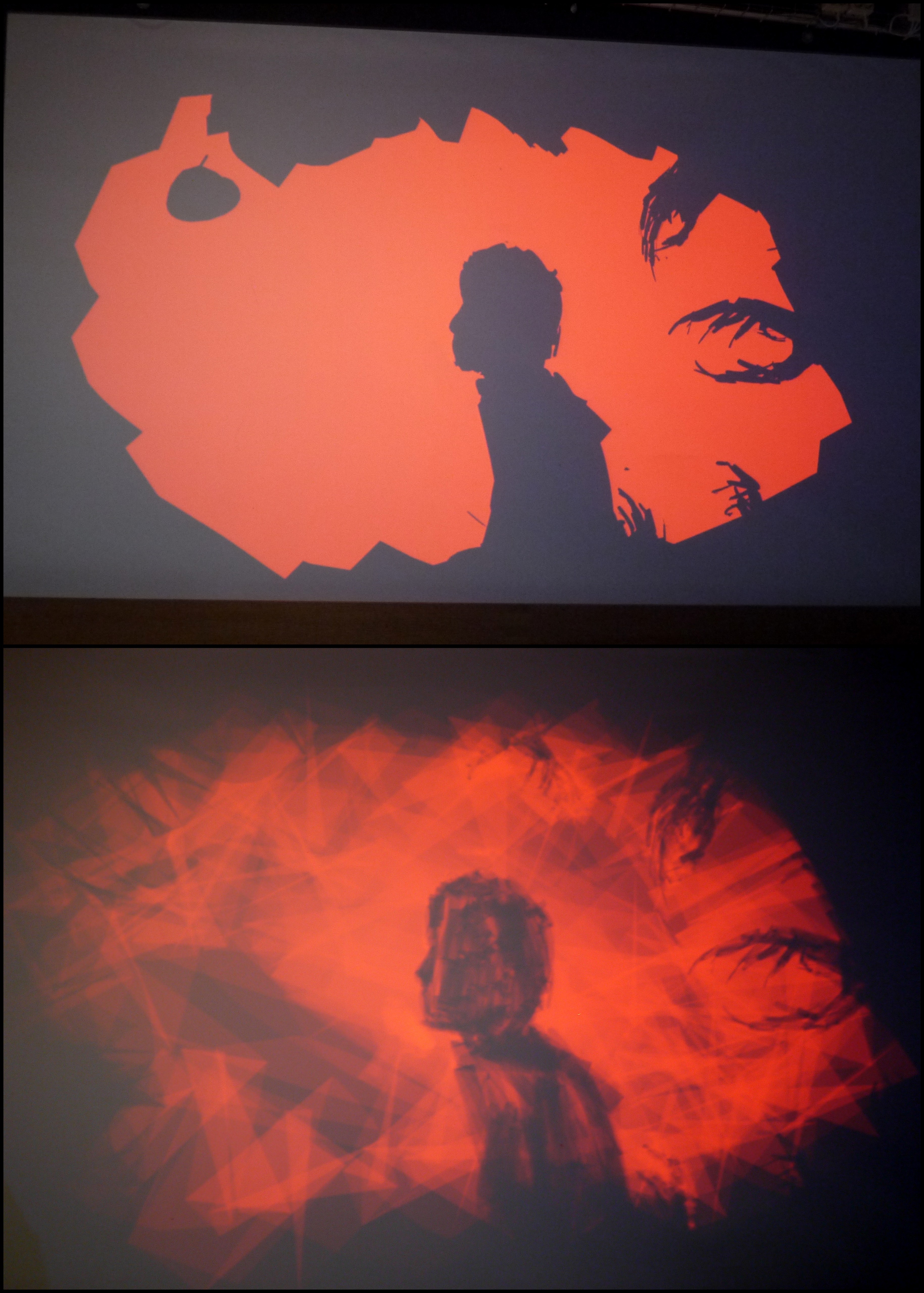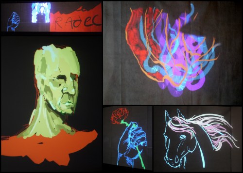 …then Dima projected this rather strange footage (from a trade fair I think, showing contemporary furniture in a kind of ‘dolls’ house’ setting). To this, I added the little silhouettes of figures in white, ‘drawing through’ the film….