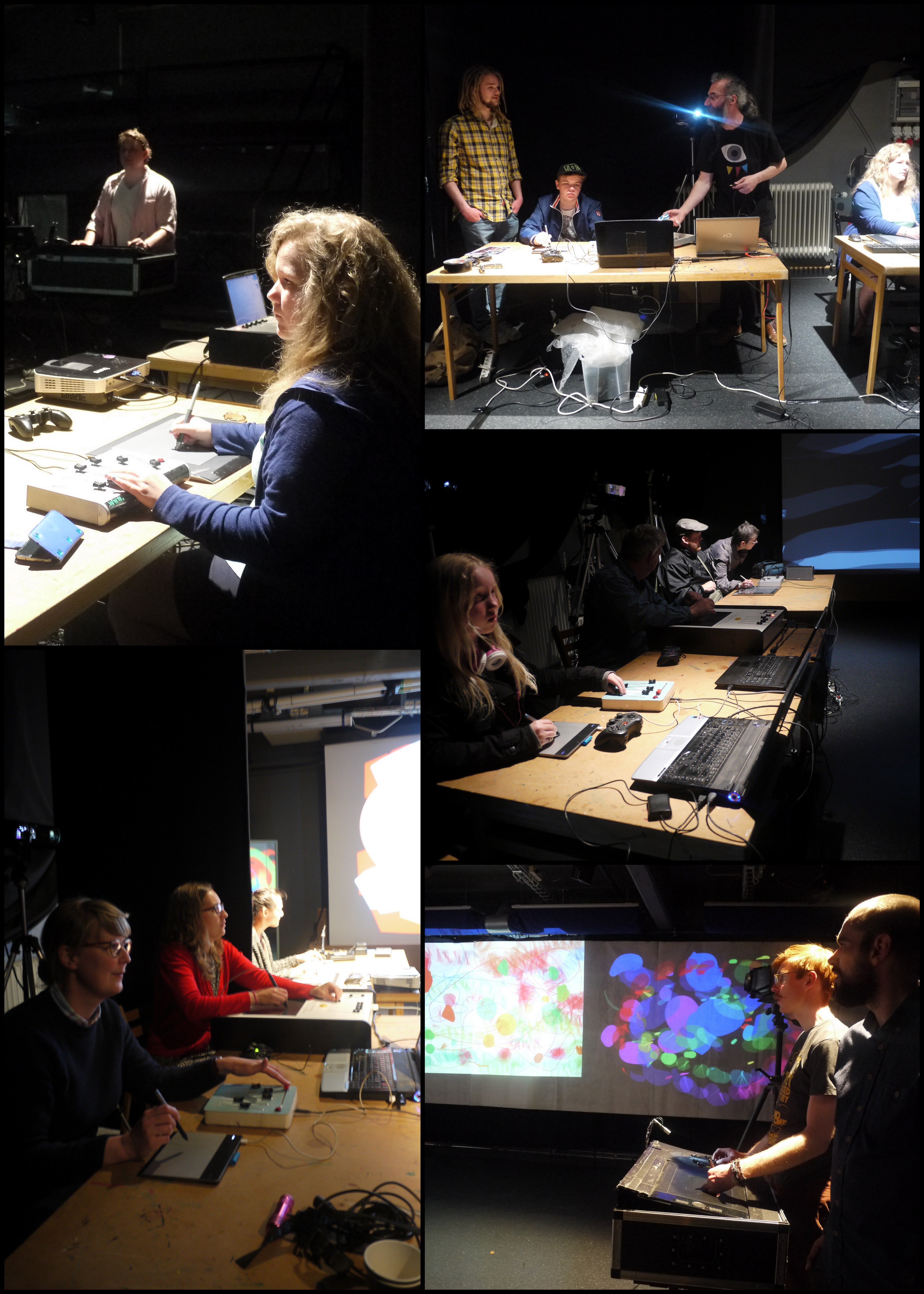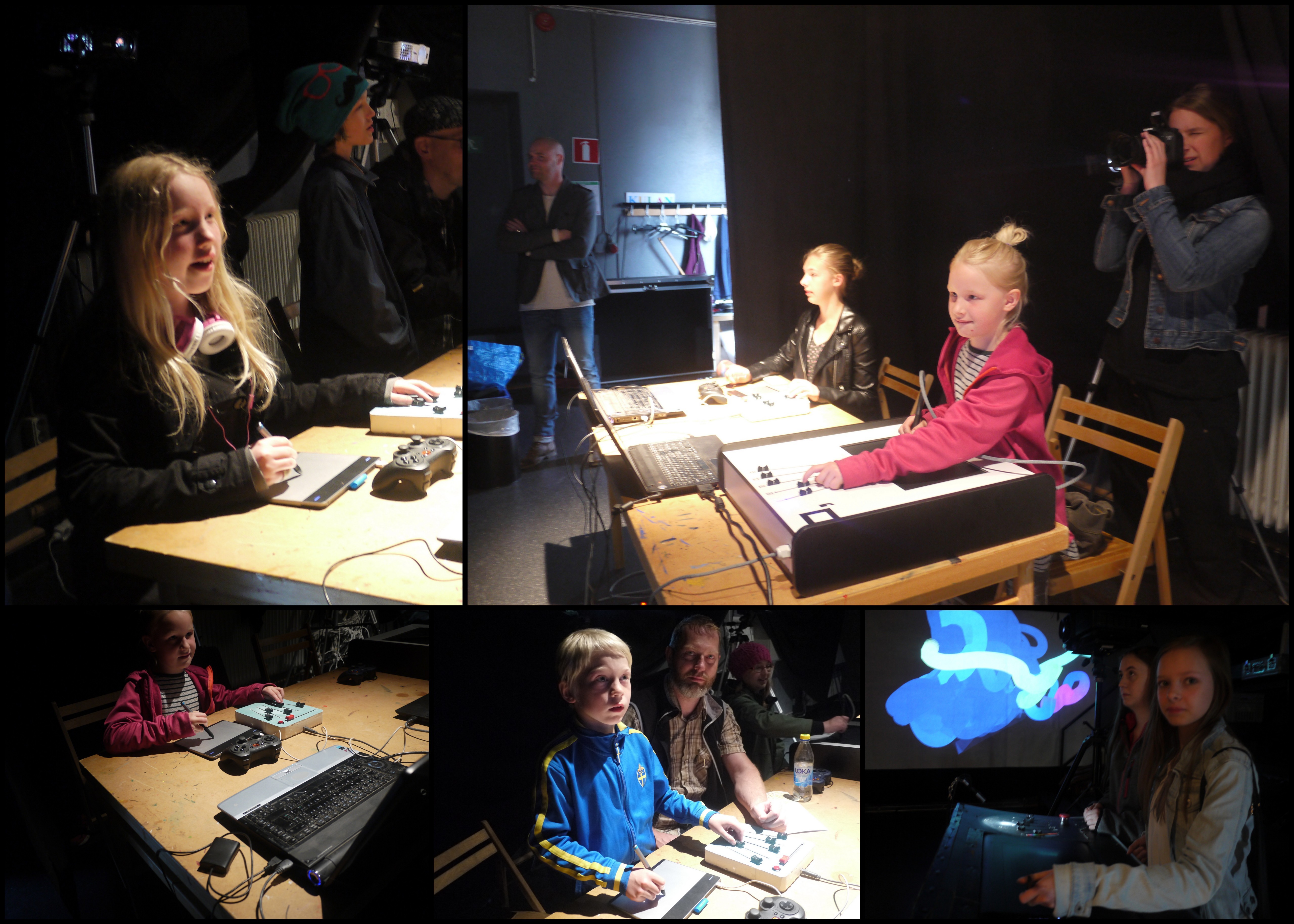 Our visit to Sweden ended with two days of Tagtooling at Barbacka, Kristianstad Municipality’s cultural centre for children and young people. On the Thursday afternoon and evening we held Tagtool workshops in one of the centre’s buildings which was normally used as a rehearsal room. This was an ideal venue (no windows!) to hold daytime ‘drop in’ Tagtool drawing sessions. One wall had a big projection screen and in addition we covered another wall with white fabric which meant that we could set up four Tagtool workstations.