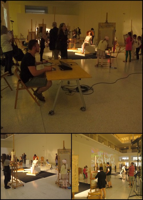 The photo above shows the drawing I made to announce the workshop at the Veletržní palác organised by the National Gallery Education Department. Young visitors were invited to make drawings inspired by the current special exhibition, ‘Kokoschka and Prague’. At one end of the hall there was an artist demonstrating drawing in watercolours while at the other end I had this wonderful big wall (all to myself!) for my Tagtool drawing. For the visitors there were easels, paper, watercolours and a variety of drawing materials, Dima set up our two Tagtool minis for people to try and dotted about the space there were models posing.