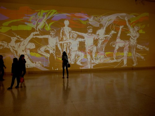 This was a wonderful place to draw! And despite the amount of light both from the street outside and from the galleries above, our new Epson projector gave this good bright wide angle floor to ceiling image. (But unfortunately it wasn’t easy to take photographs of such a large drawing with my little camera).