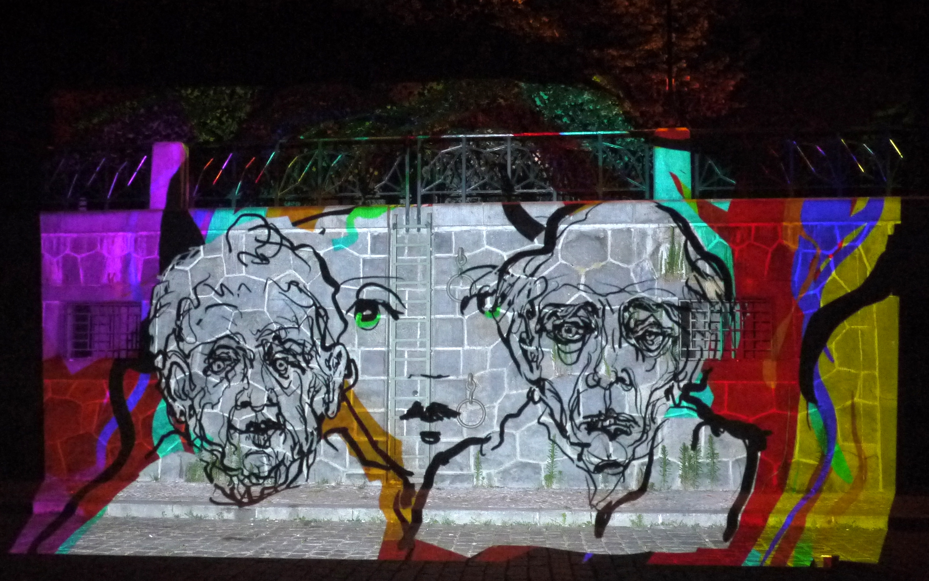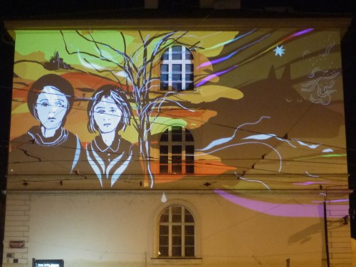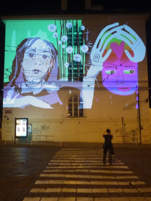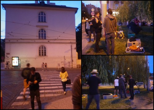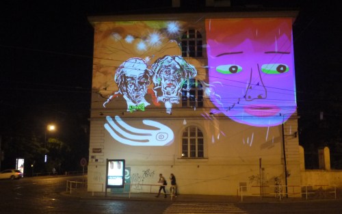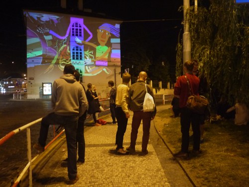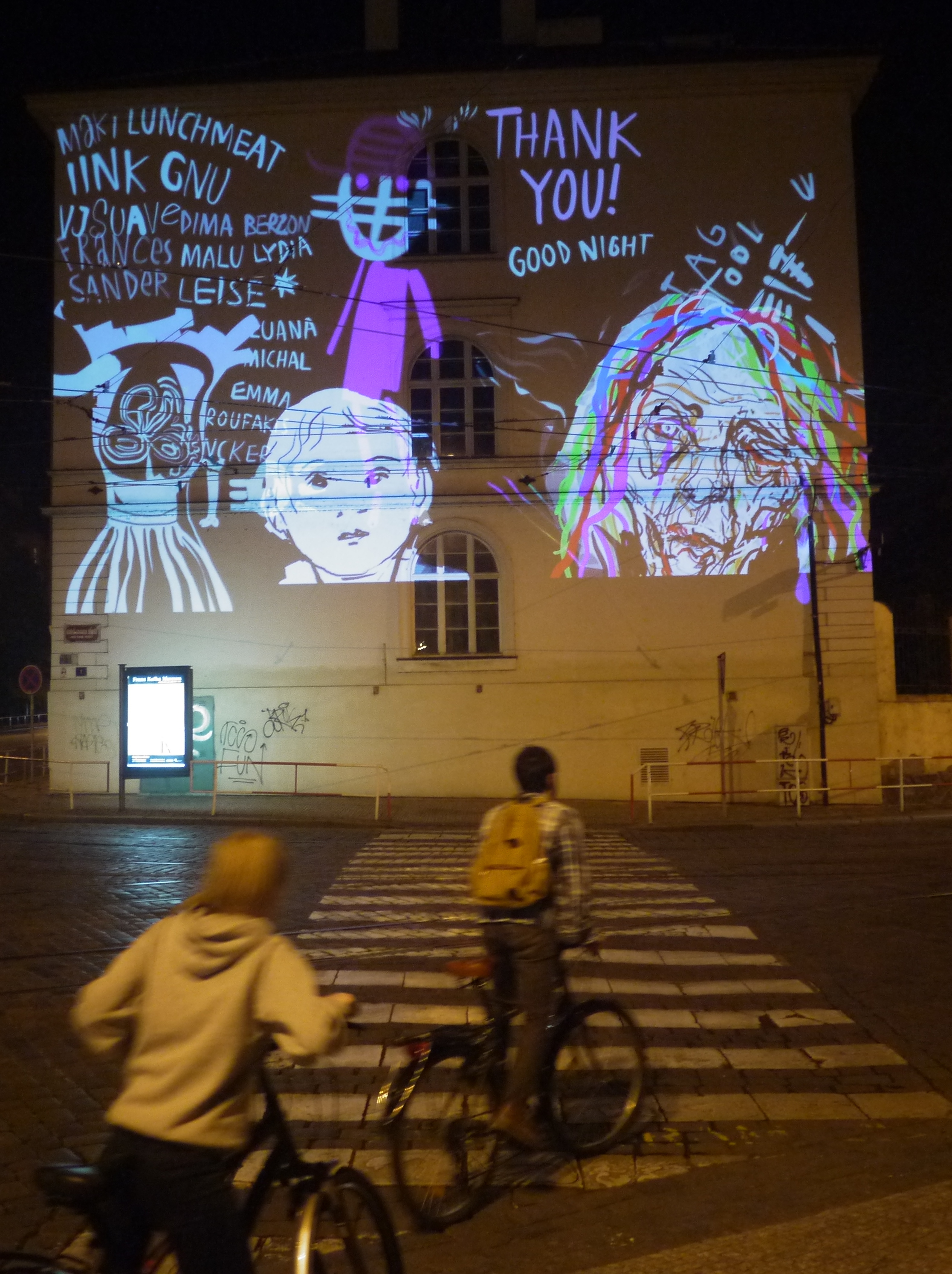 We met up with the Lunchmeat crew in Prague before it got dark to set up the Tagtools and projectors under the trees in the park. The big picture in the collage below shows the building at Malostranska in the centre of Prague chosen by Lunchmeat for the outdoor event – what a great location for Tagtooling!