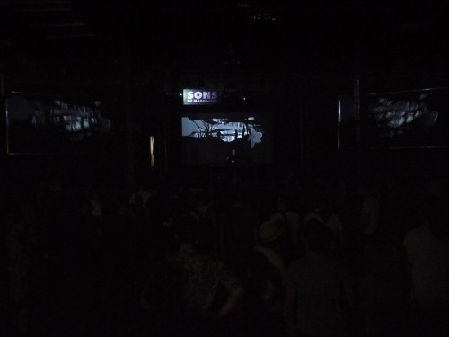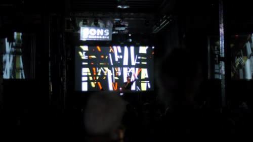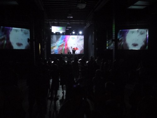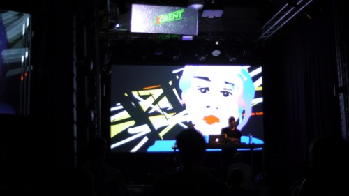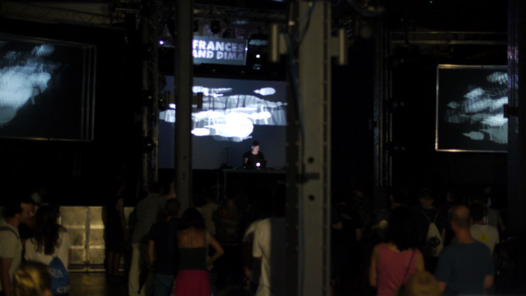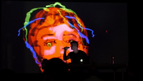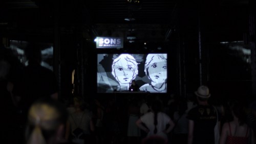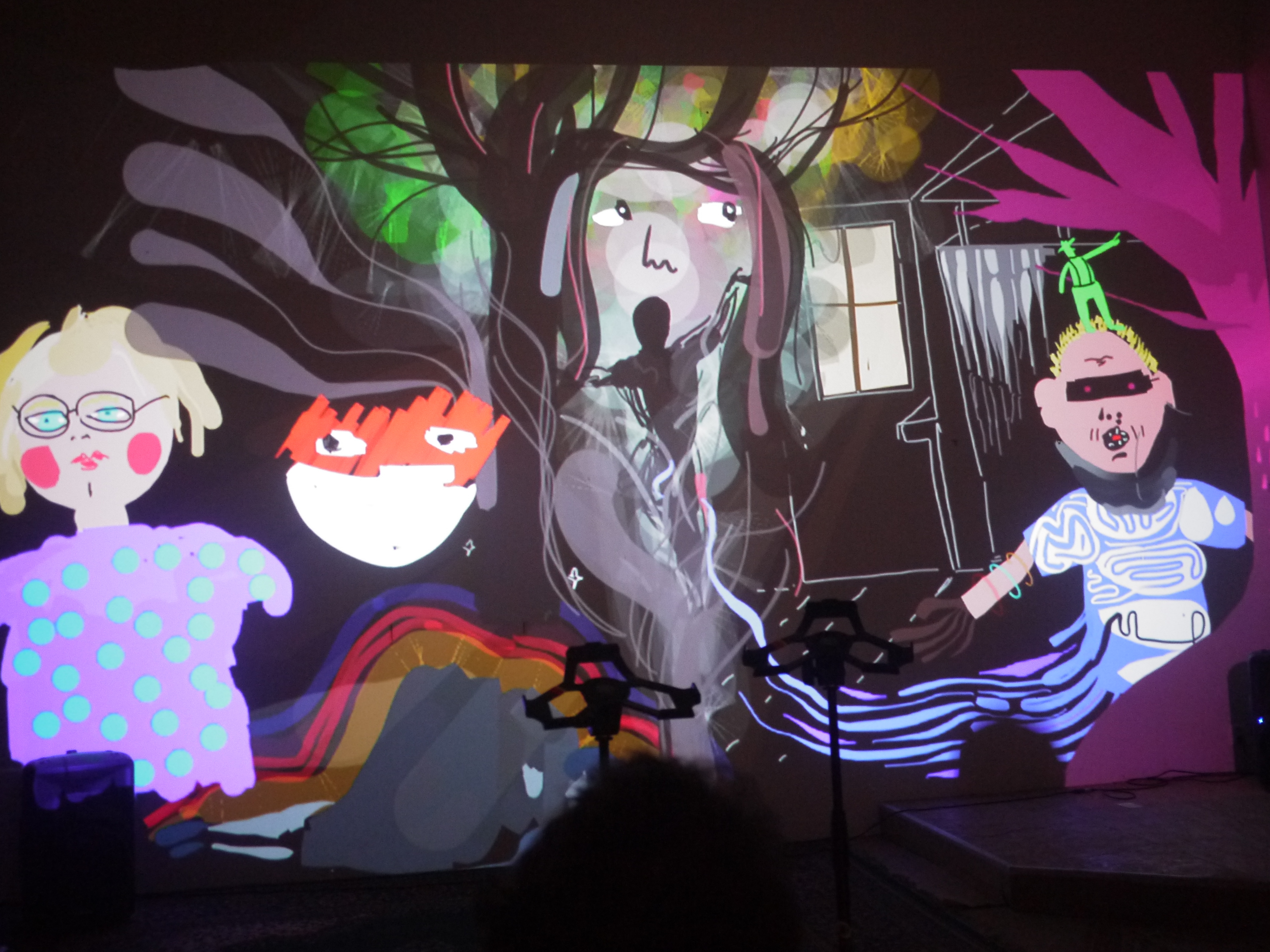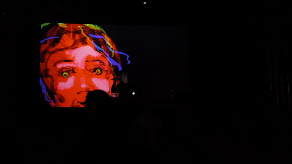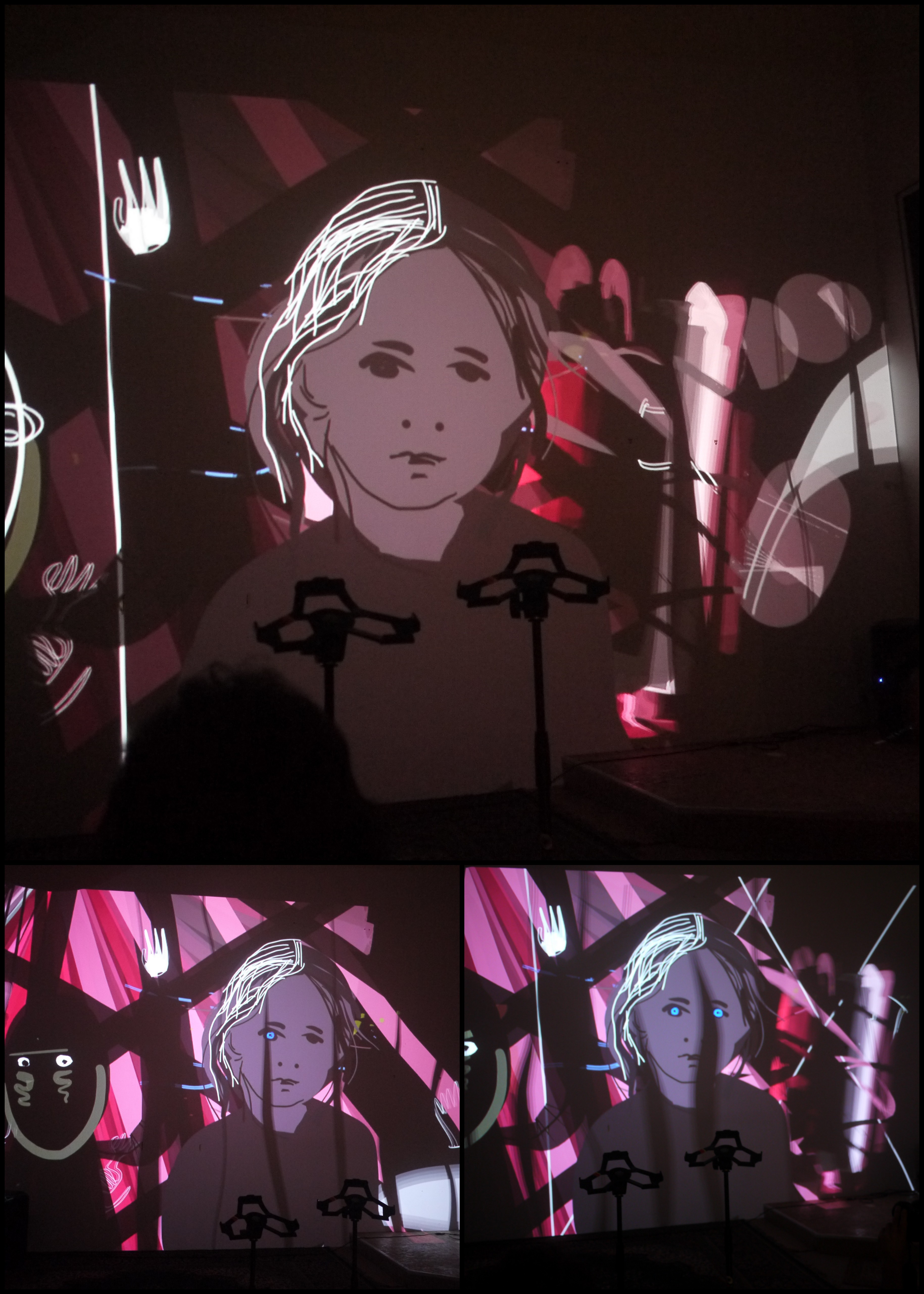 The Lunchmeat crew had this big screen set up behind the stage with mesh ‘wings’ on either side which meant that two ghostly versions of my images appeared on either side of the stage when I was drawing. I began with a lot of transparent ‘clouds’ which Dima then animated, enabling me to have a moving and continuously changing background over which to develop my drawing. Using animation like this with the ‘old-school’ Tagtool is something new for us in a performance – and although it was often difficult for me to draw against this moving background it looked very effective. I don’t have any video so the photos (kindly taken for us by Gome) will have to serve to give some idea of this process.