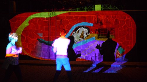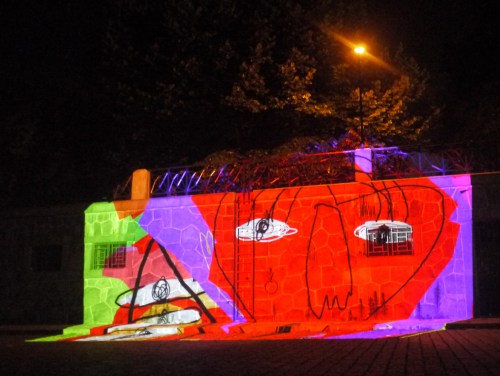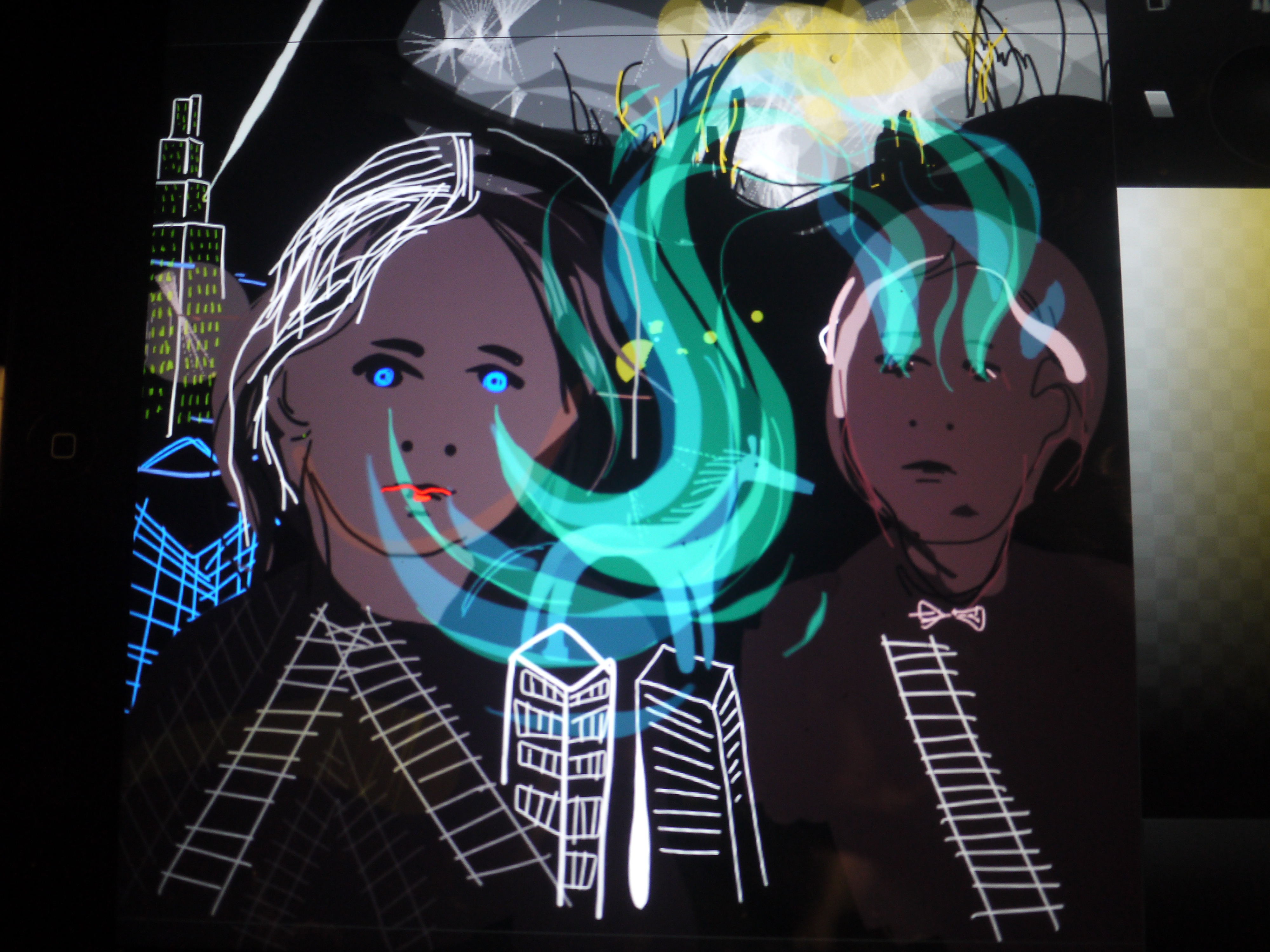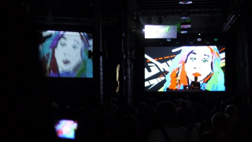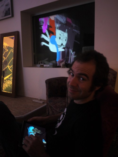 It’s the first time we have tried a multiplayer session like this on the street using all the Tagtools and it was quite a complex set up that took a little time to get used to. We were using two matching Epson projectors, one for the ‘old-school’, the other for the iPads – ours and one from Lunchmeat – which worked brilliantly. (Since we invested in this Epson 6000 full HD projector we’ve used it at every event, indoors and out – it wasn’t cheap, but it was definitely worth saving up for!!) I haven’t many photos as most of the time I was busy drawing, but below are two stills from an animation by VJ Suave, Maki and Iink…