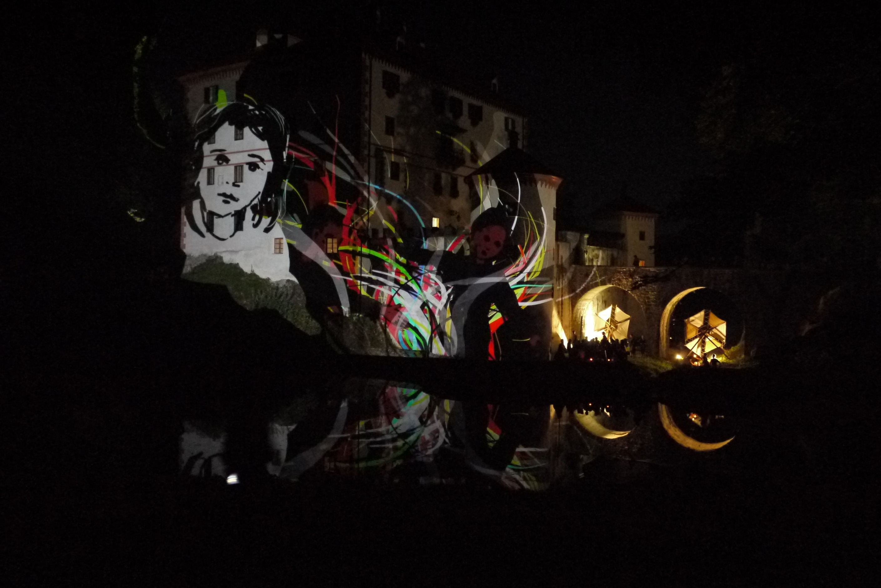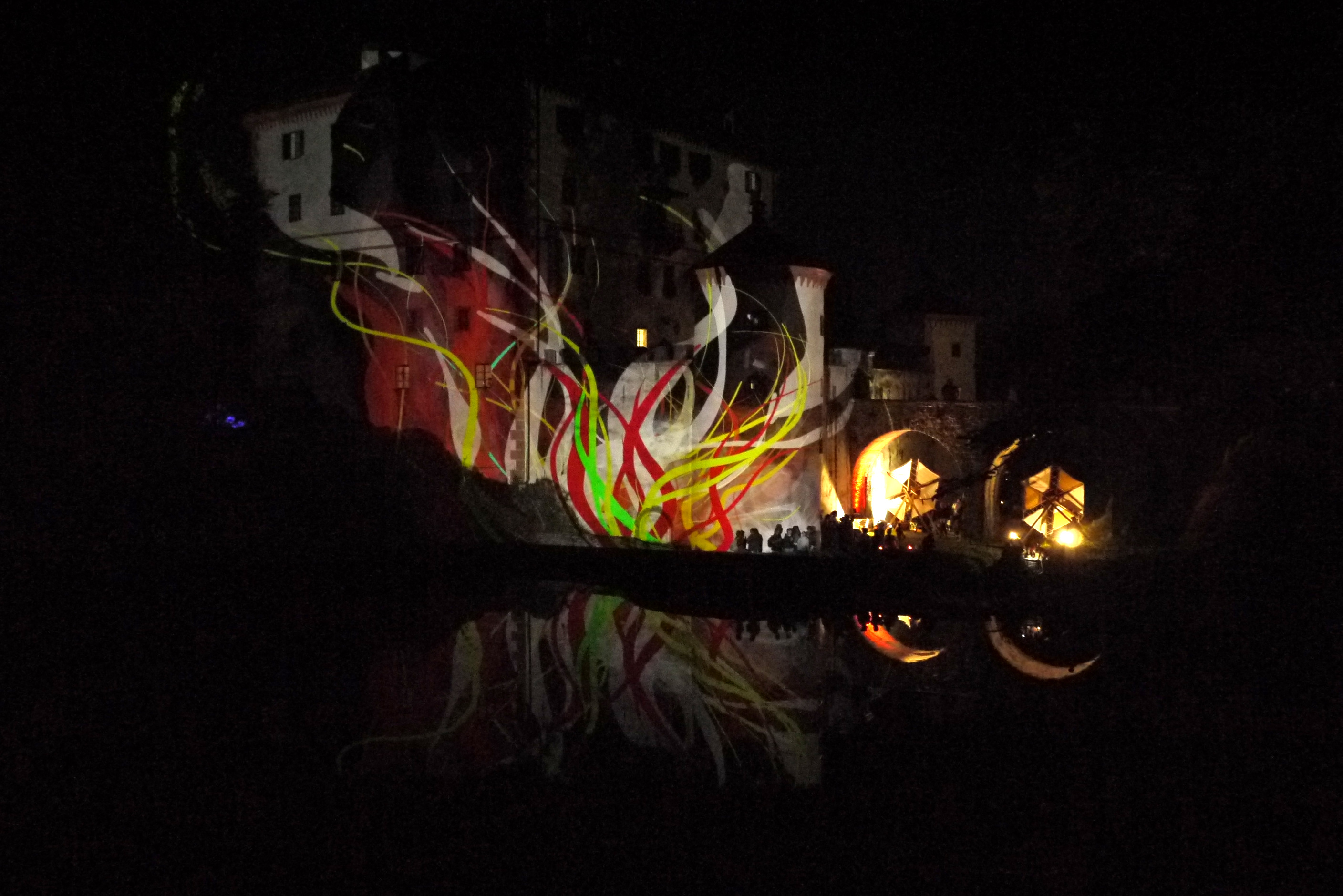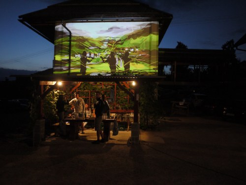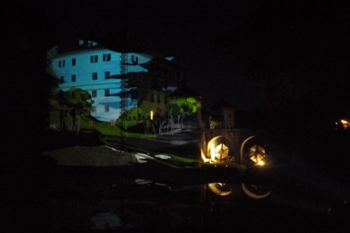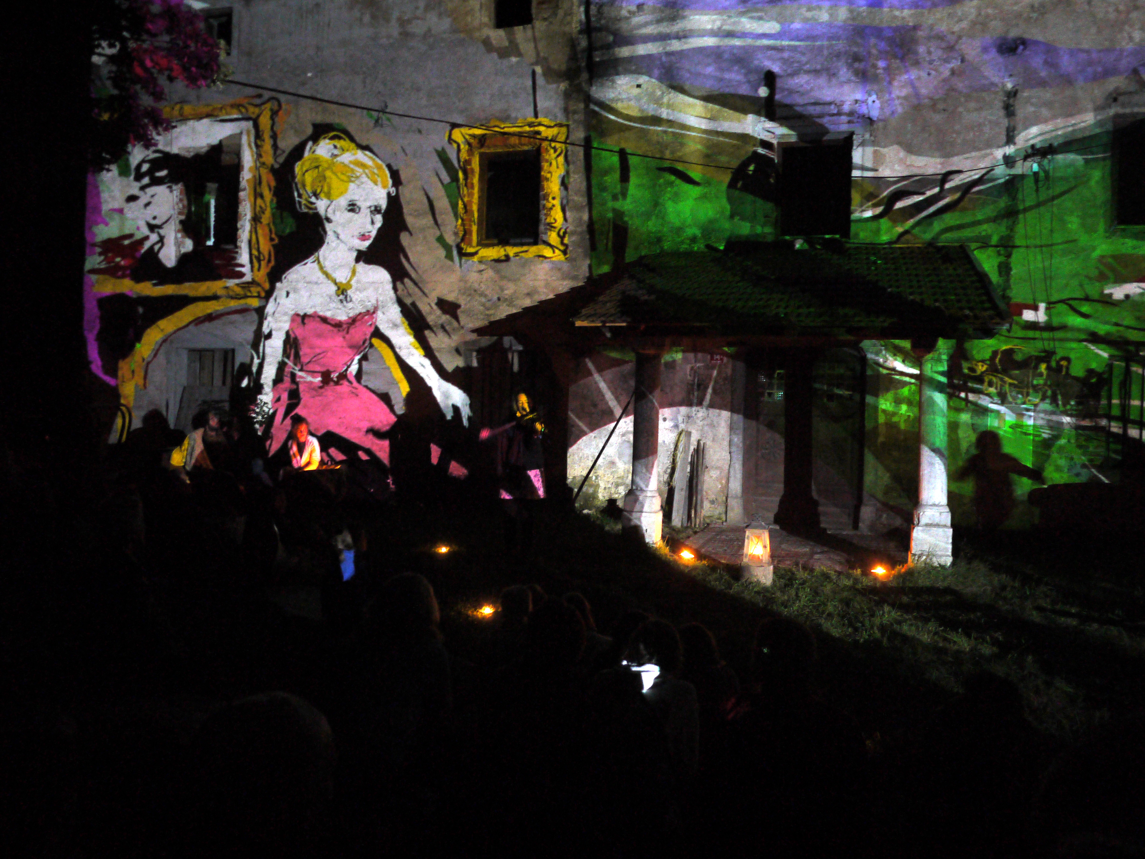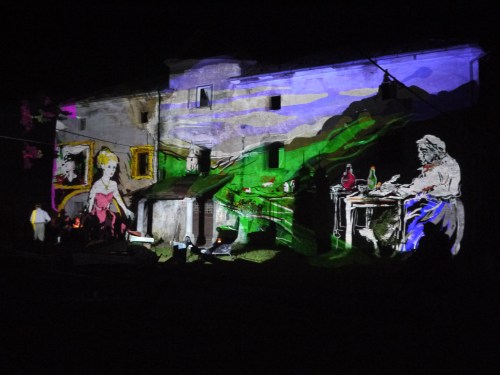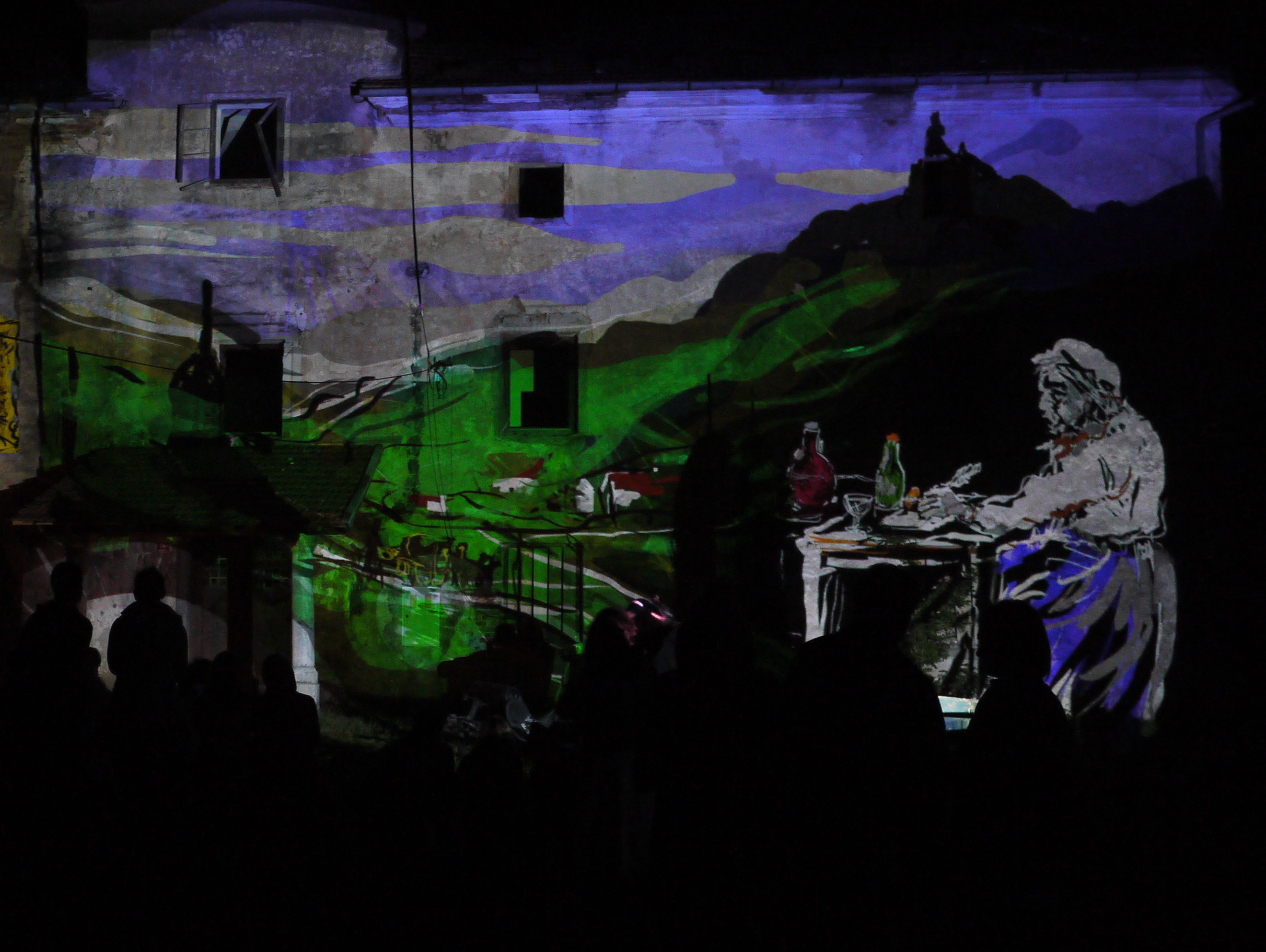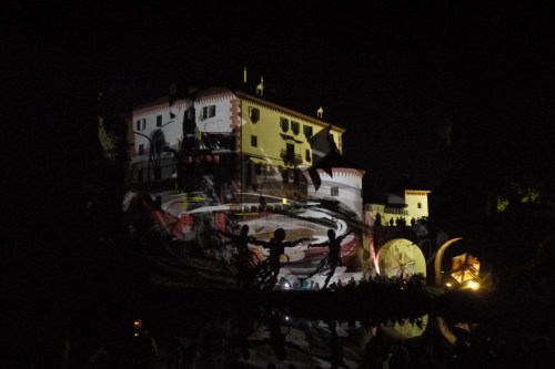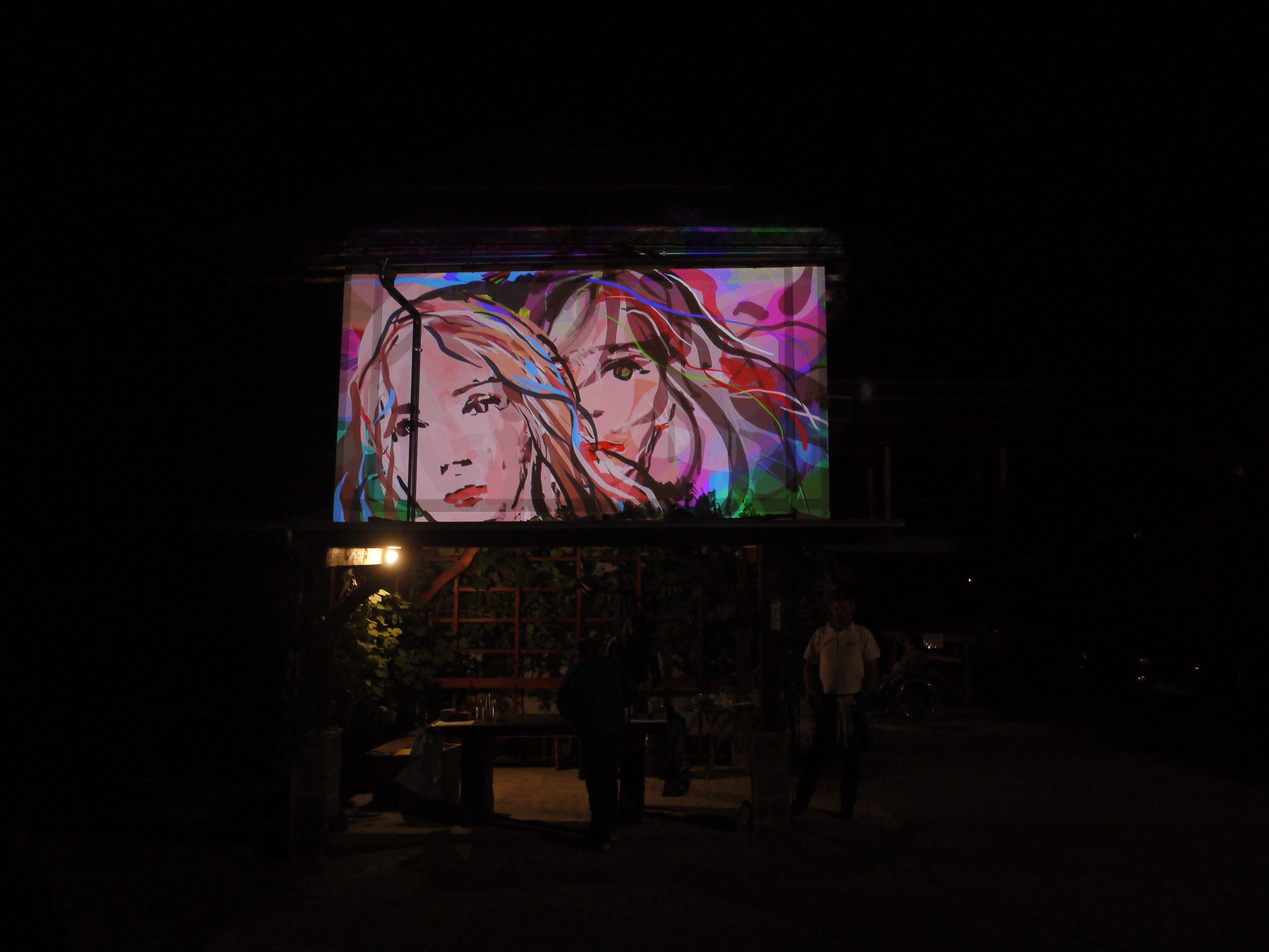 A few days later we were projecting on the front of this 16C castle, Koča vas at Markovec. Now uninhabited, this beautifully proportioned Renaissance building once was the home of a German nobleman and letters dating from 17C century from the widow of this nobleman to her daughter who was living in Trieste were found recently. These were of great historical significance, not only because of the vivid picture they provided of life at that time, but that they were written in Slovenian, not German which then would have been the first language of the nobility. Milena Ožbolt read a selection of these letters at the open air concert given by musicians from the Etno histeria orchestra while I made a Tagtool drawing on the front of the castle as a background to their performance.