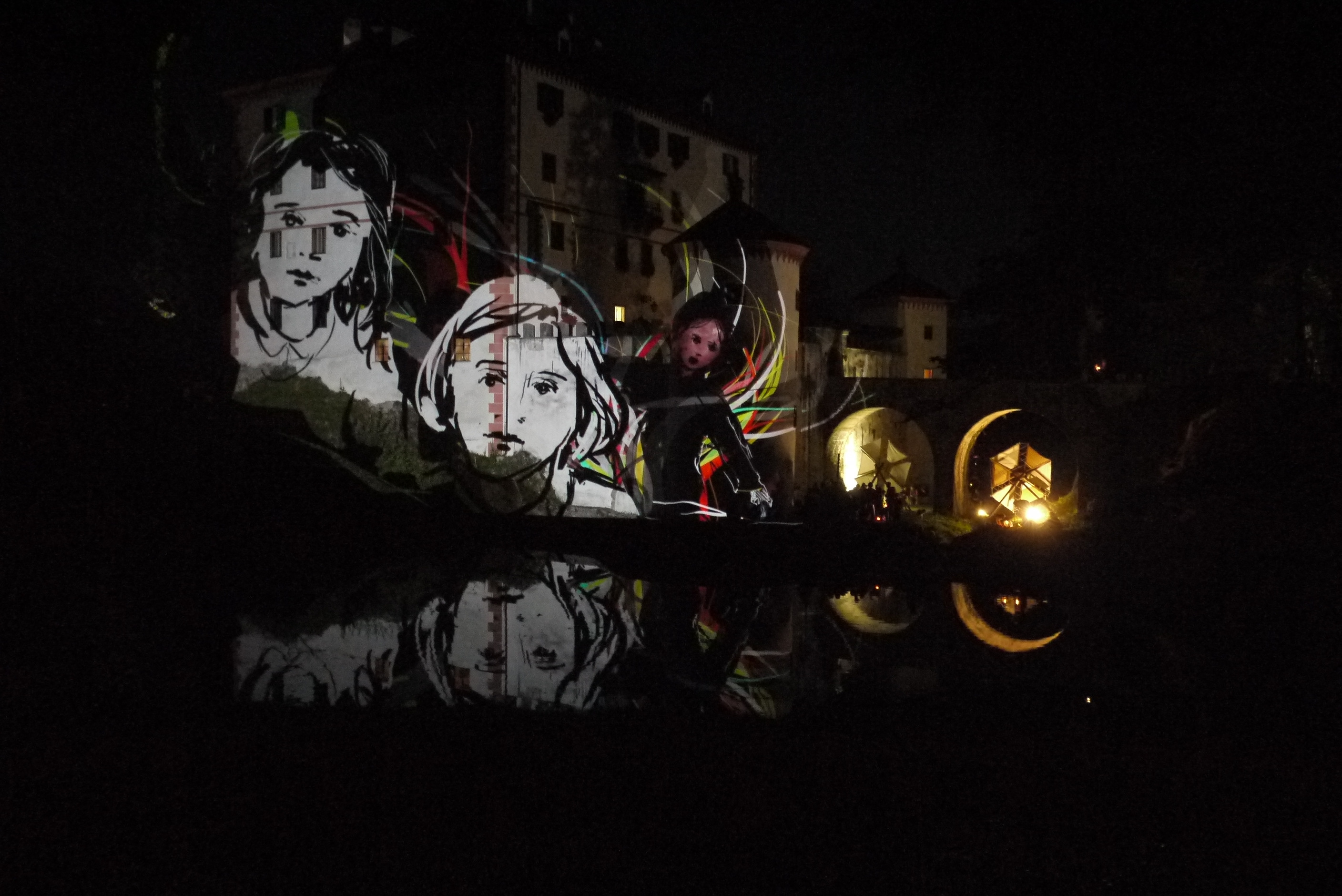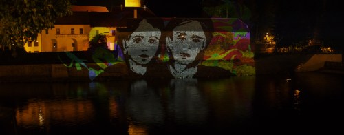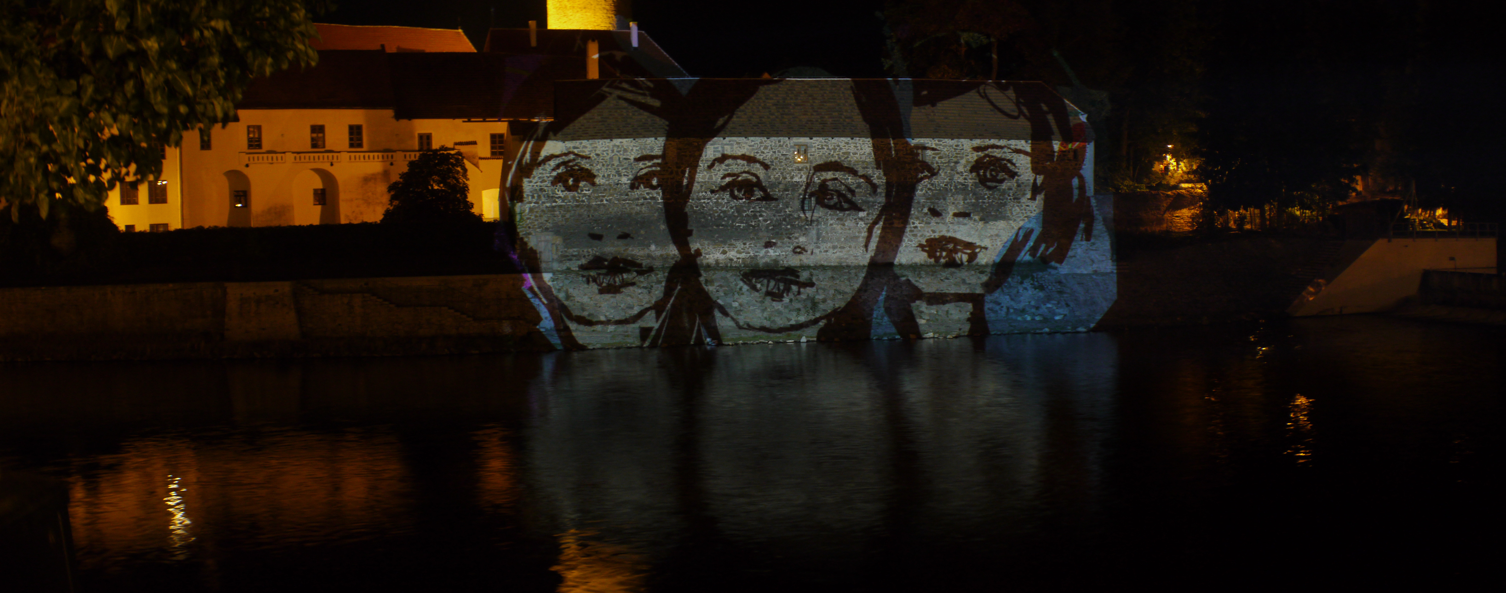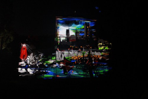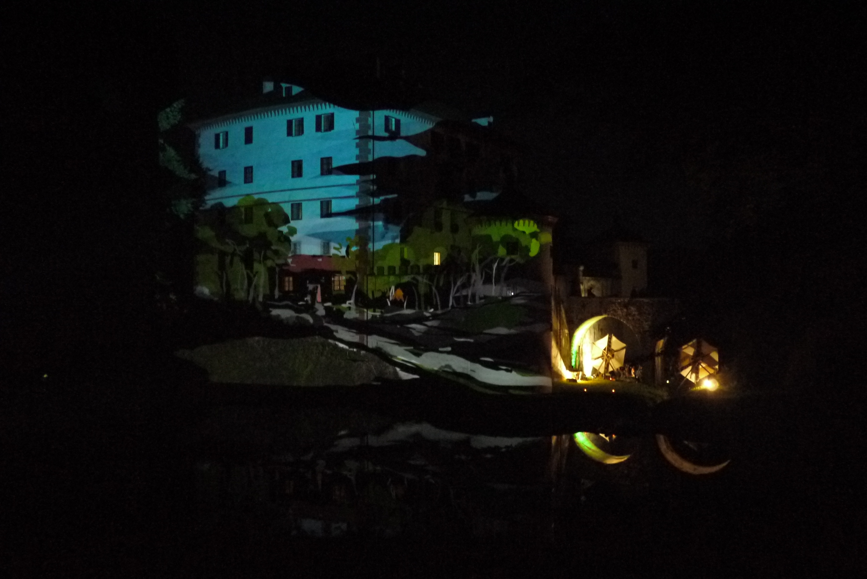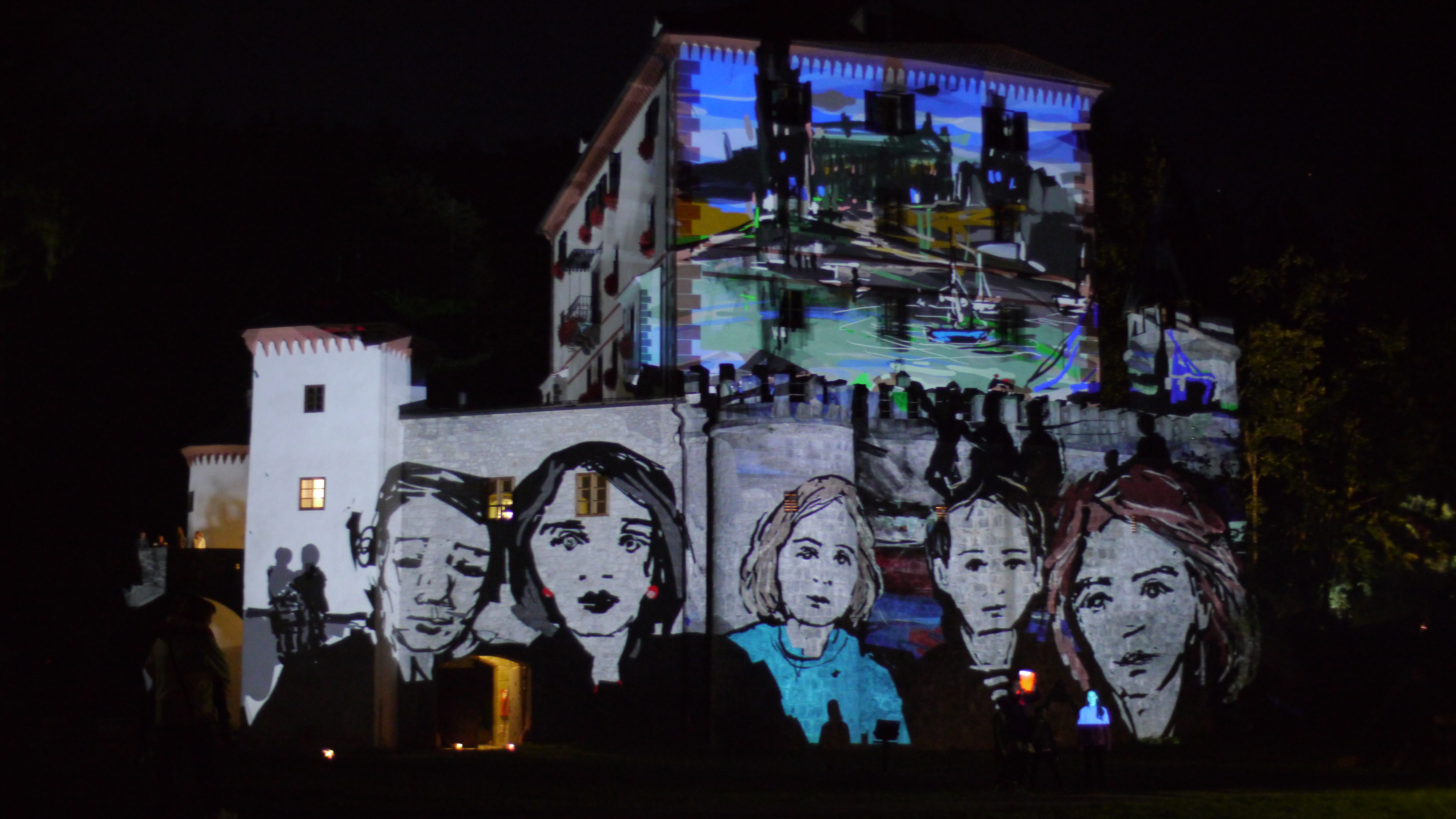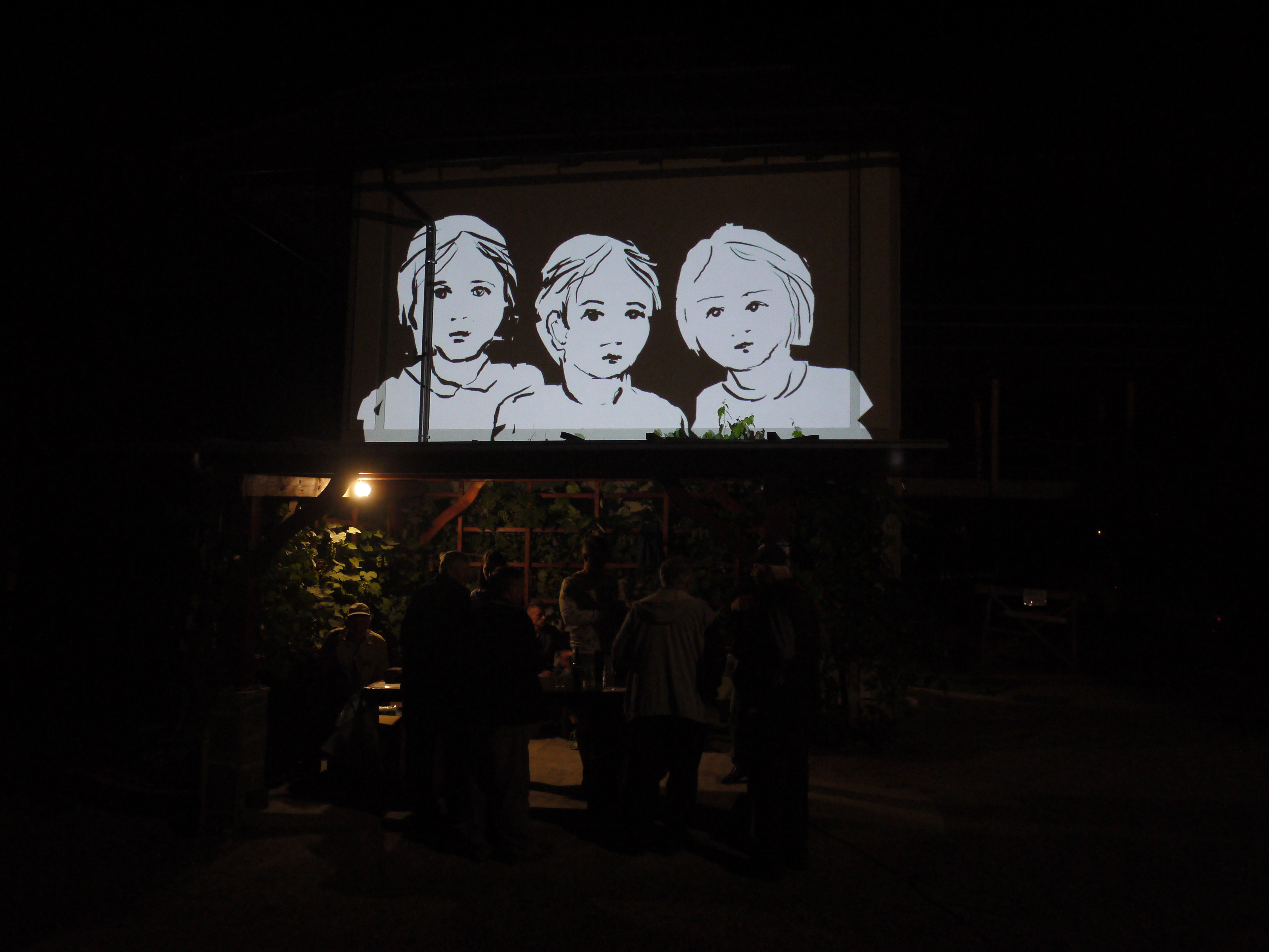 A few days later we were projecting on the front of this 16C castle, Koča vas at Markovec. Now uninhabited, this beautifully proportioned Renaissance building once was the home of a German nobleman and letters dating from 17C century from the widow of this nobleman to her daughter who was living in Trieste were found recently. These were of great historical significance, not only because of the vivid picture they provided of life at that time, but that they were written in Slovenian, not German which then would have been the first language of the nobility. Milena Ožbolt read a selection of these letters at the open air concert given by musicians from the Etno histeria orchestra while I made a Tagtool drawing on the front of the castle as a background to their performance.