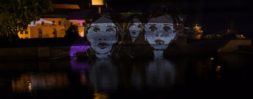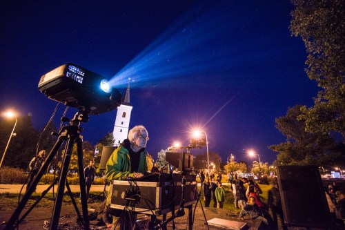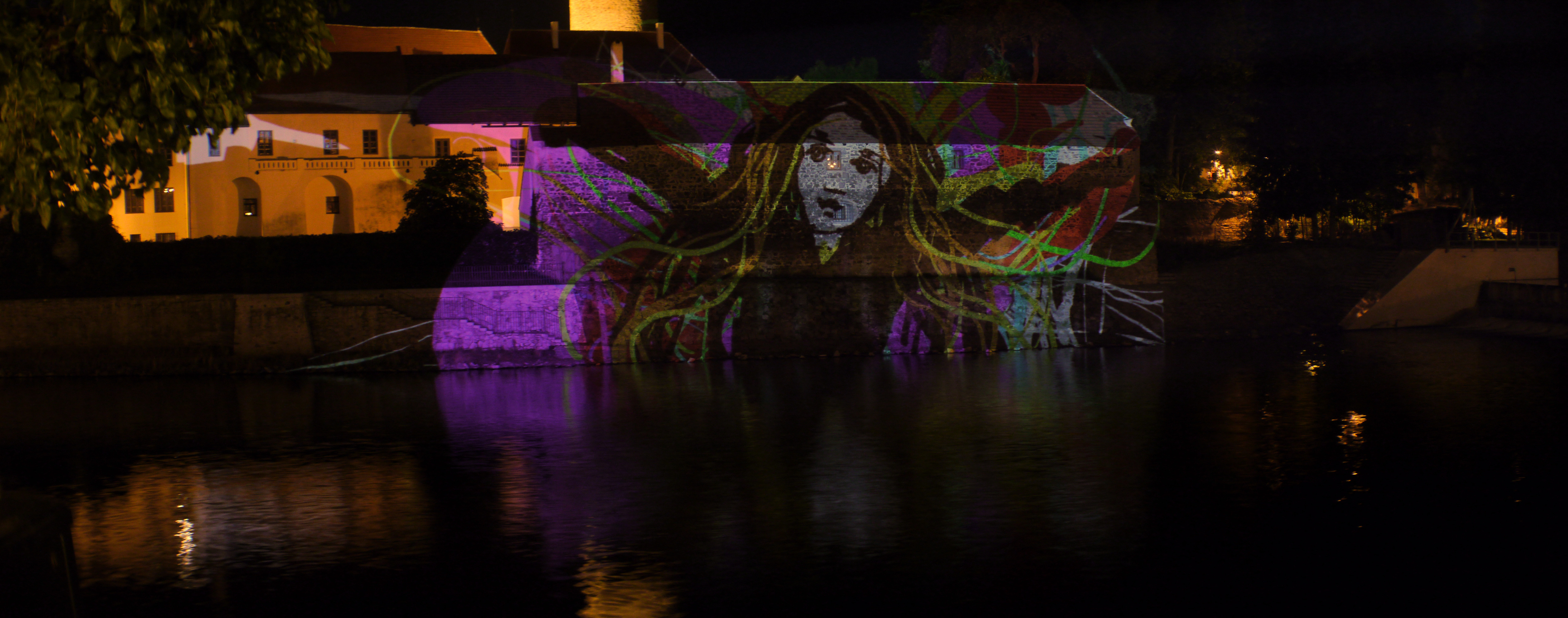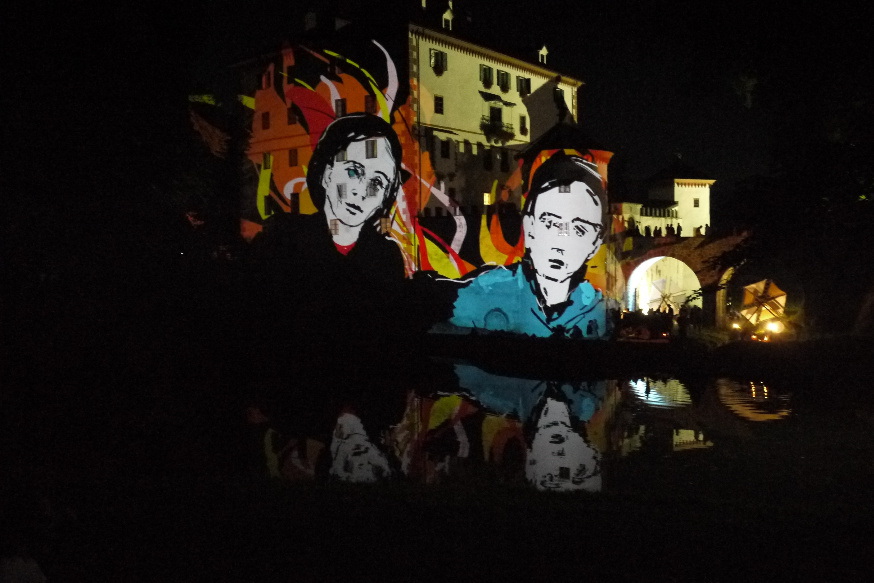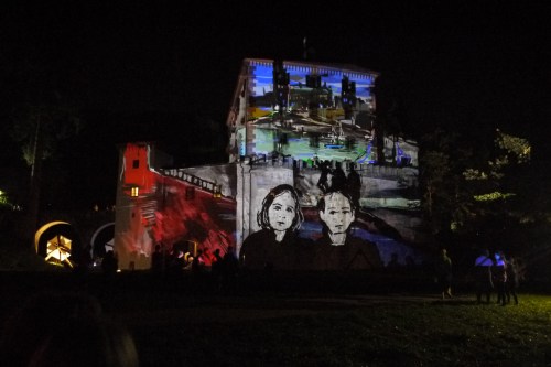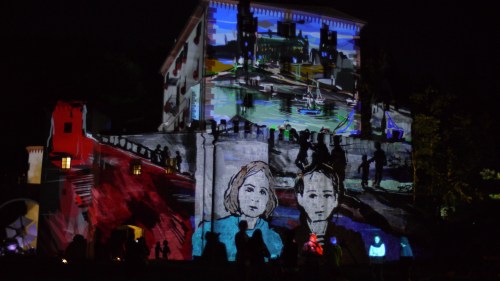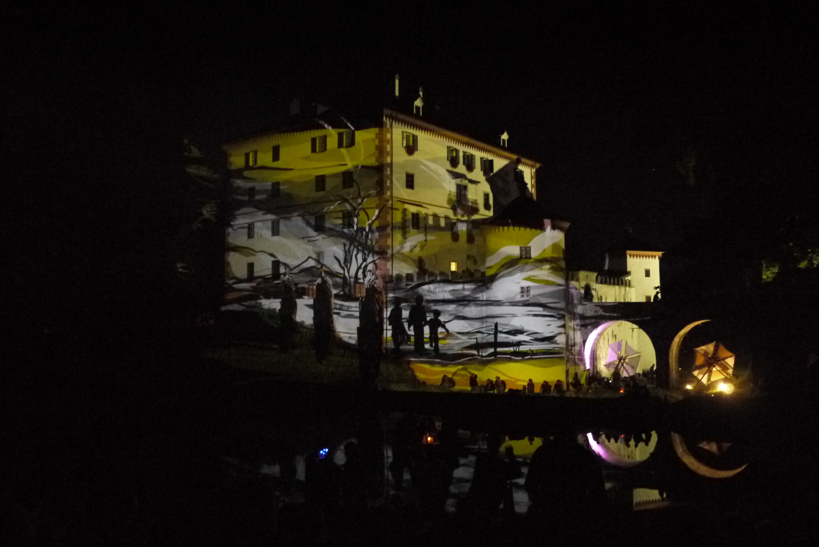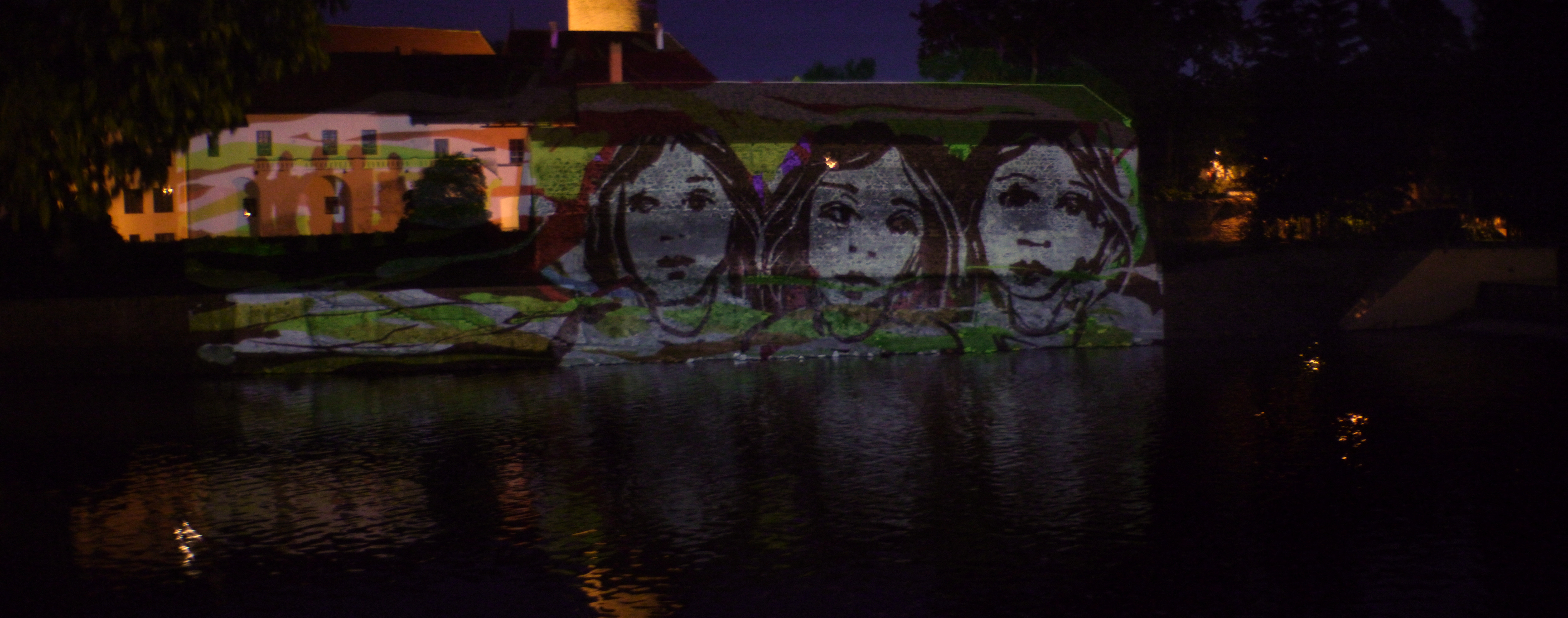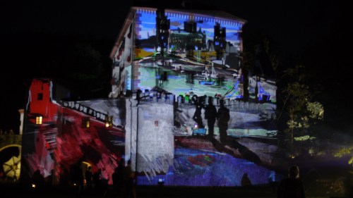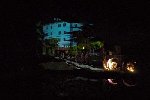 A few days later we were projecting on the front of this 16C castle, Koča vas at Markovec. Now uninhabited, this beautifully proportioned Renaissance building once was the home of a German nobleman and letters dating from 17C century from the widow of this nobleman to her daughter who was living in Trieste were found recently. These were of great historical significance, not only because of the vivid picture they provided of life at that time, but that they were written in Slovenian, not German which then would have been the first language of the nobility. Milena Ožbolt read a selection of these letters at the open air concert given by musicians from the Etno histeria orchestra while I made a Tagtool drawing on the front of the castle as a background to their performance.