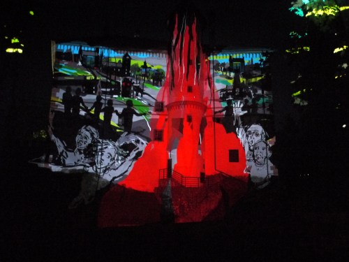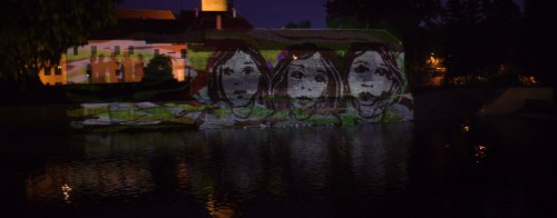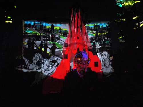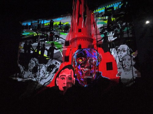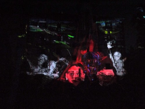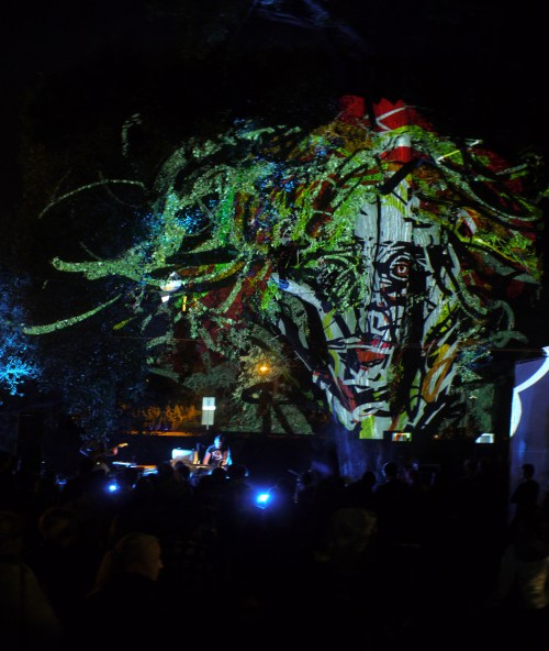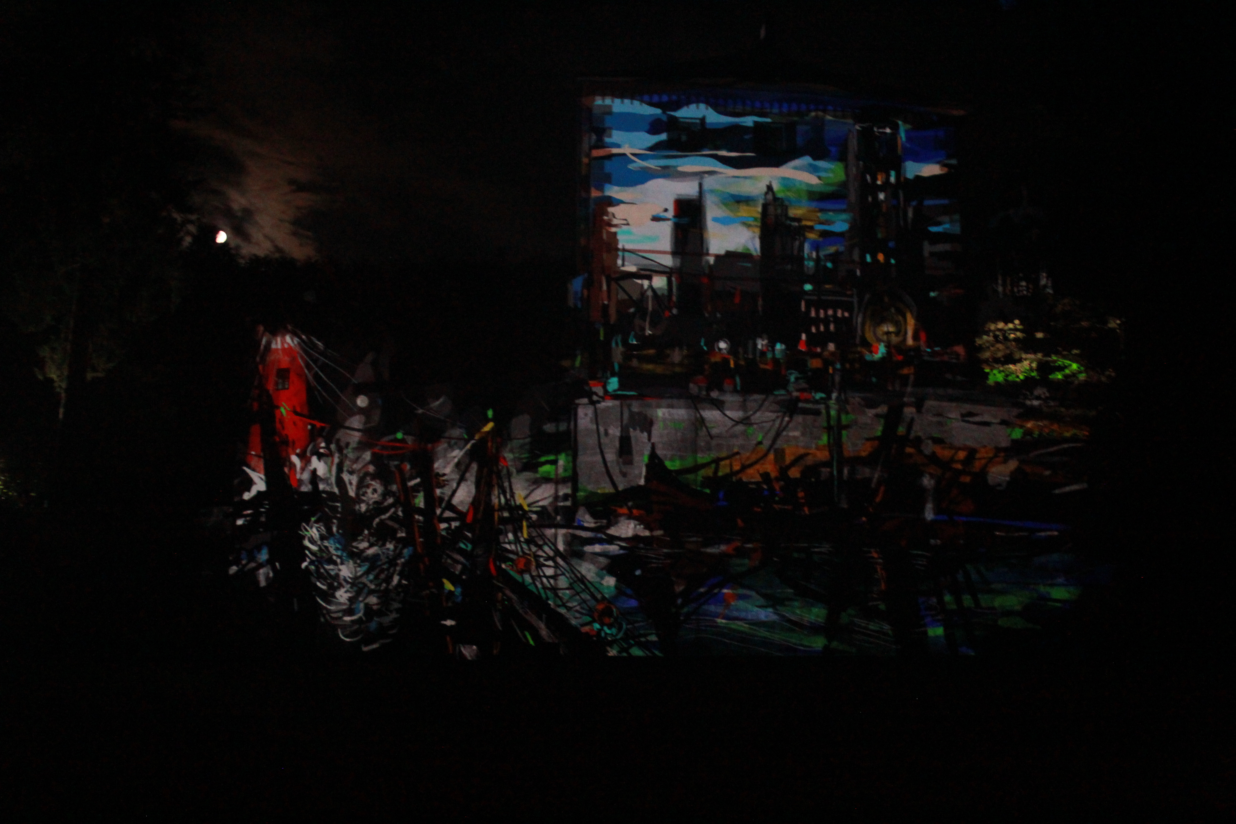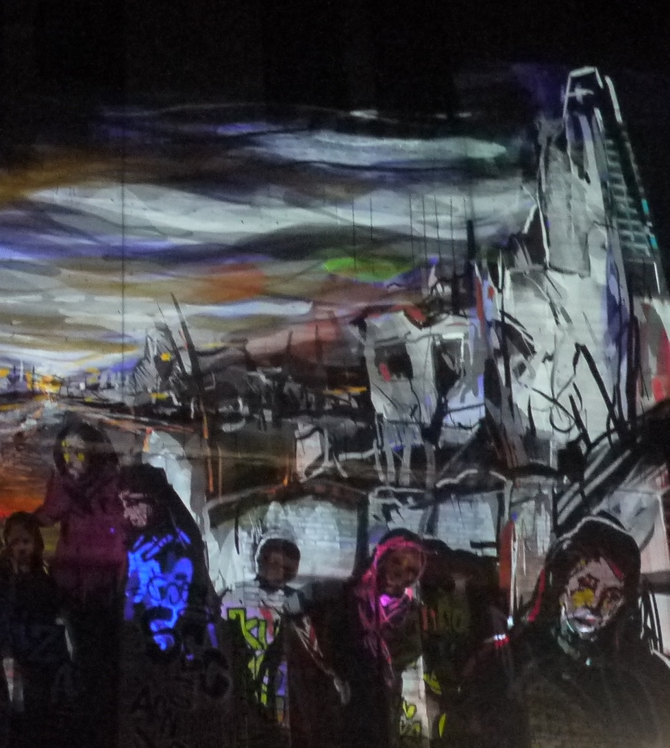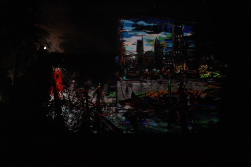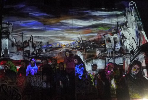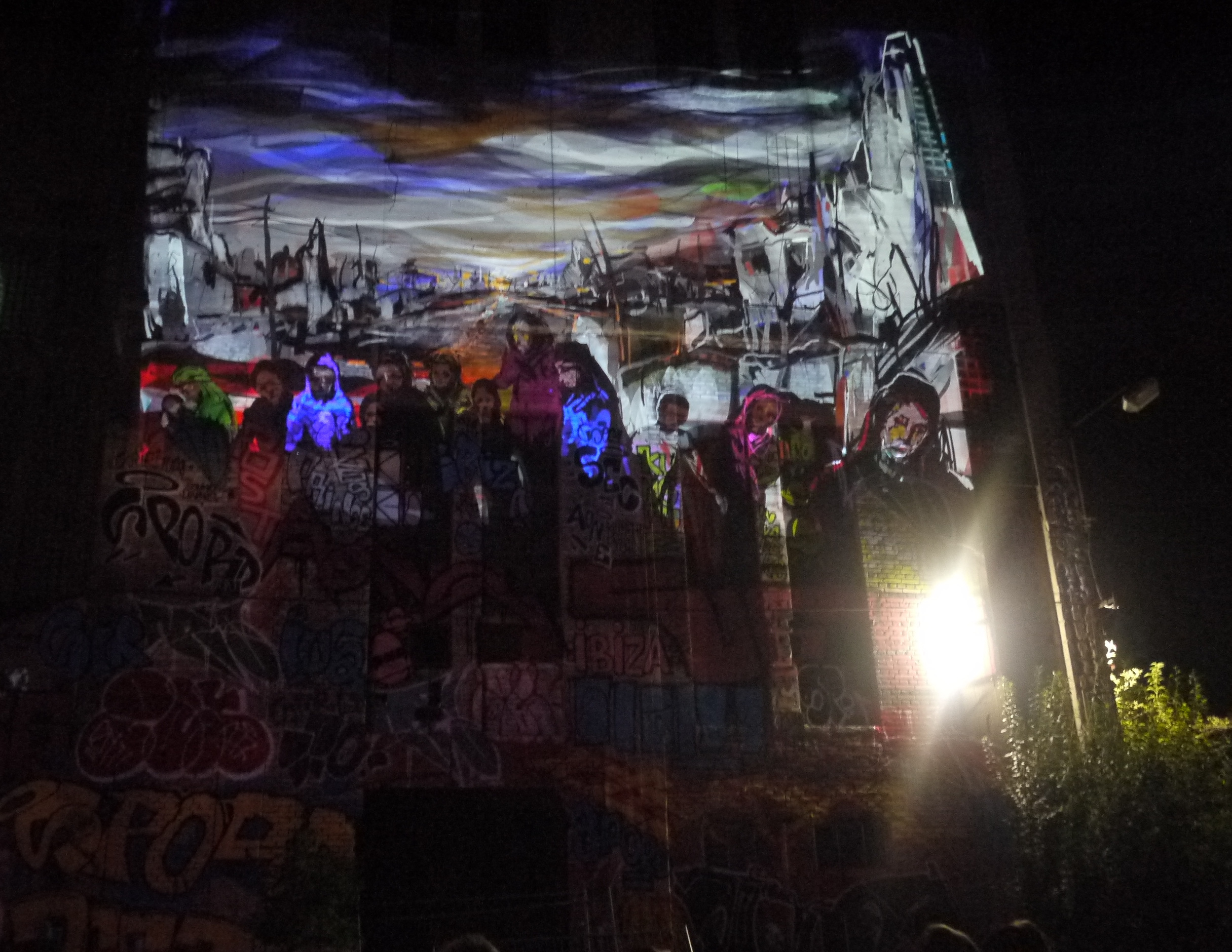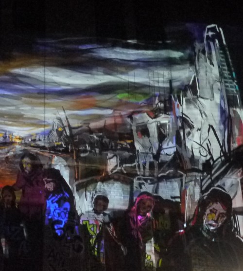 We trained the projector on the upper part of the building so that I would be able to ‘grow’ my drawing out of the spray painting below that had been made by a graffiti crew for the opening of the festival. This light on the corner of the building made it very difficult to take photographs and I haven’t got any of the earlier stages of the drawing…but here is one showing the finished mural just before I made the final fade and my drawing disappeared into the darkness.