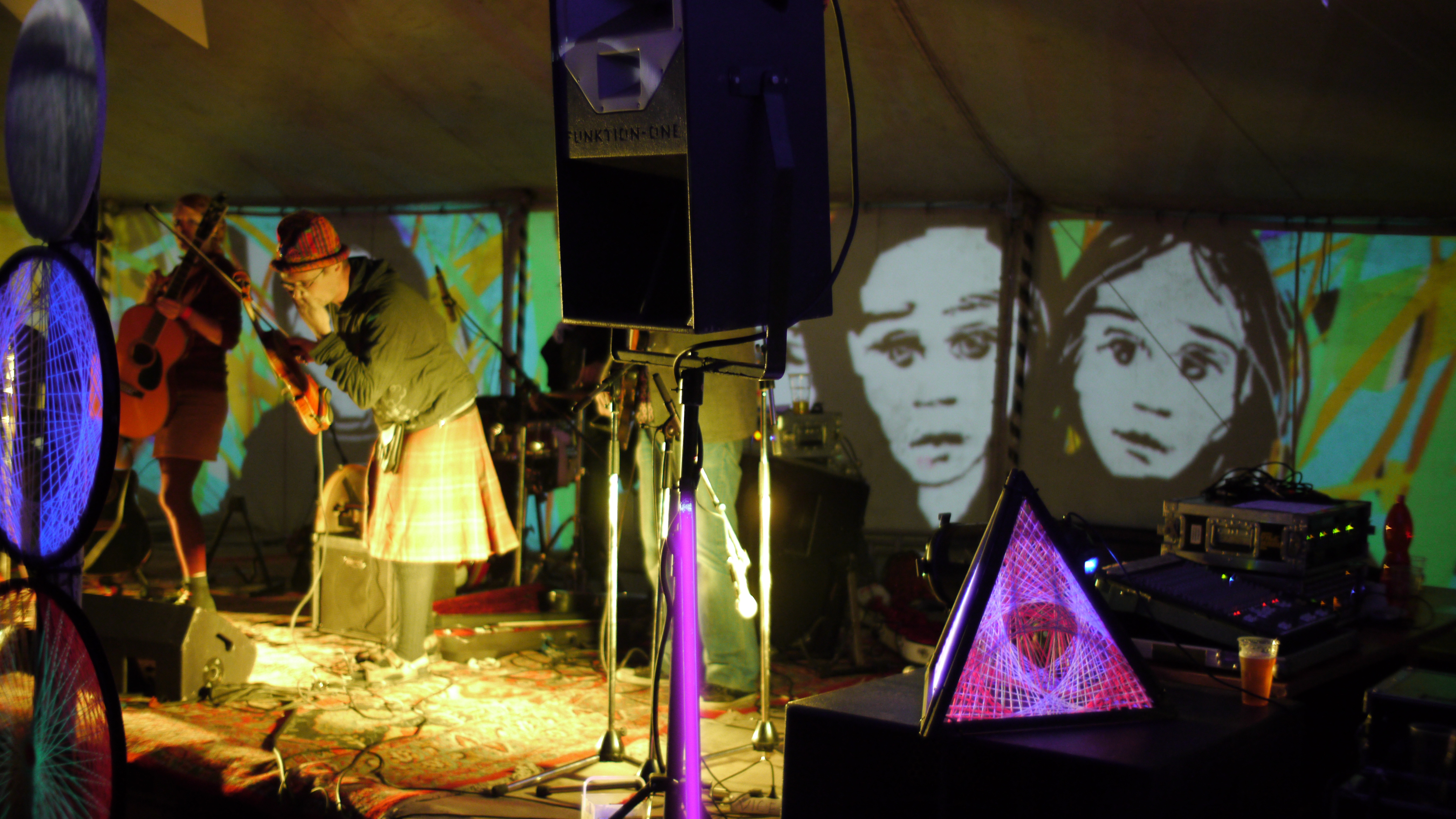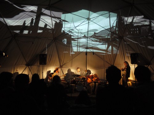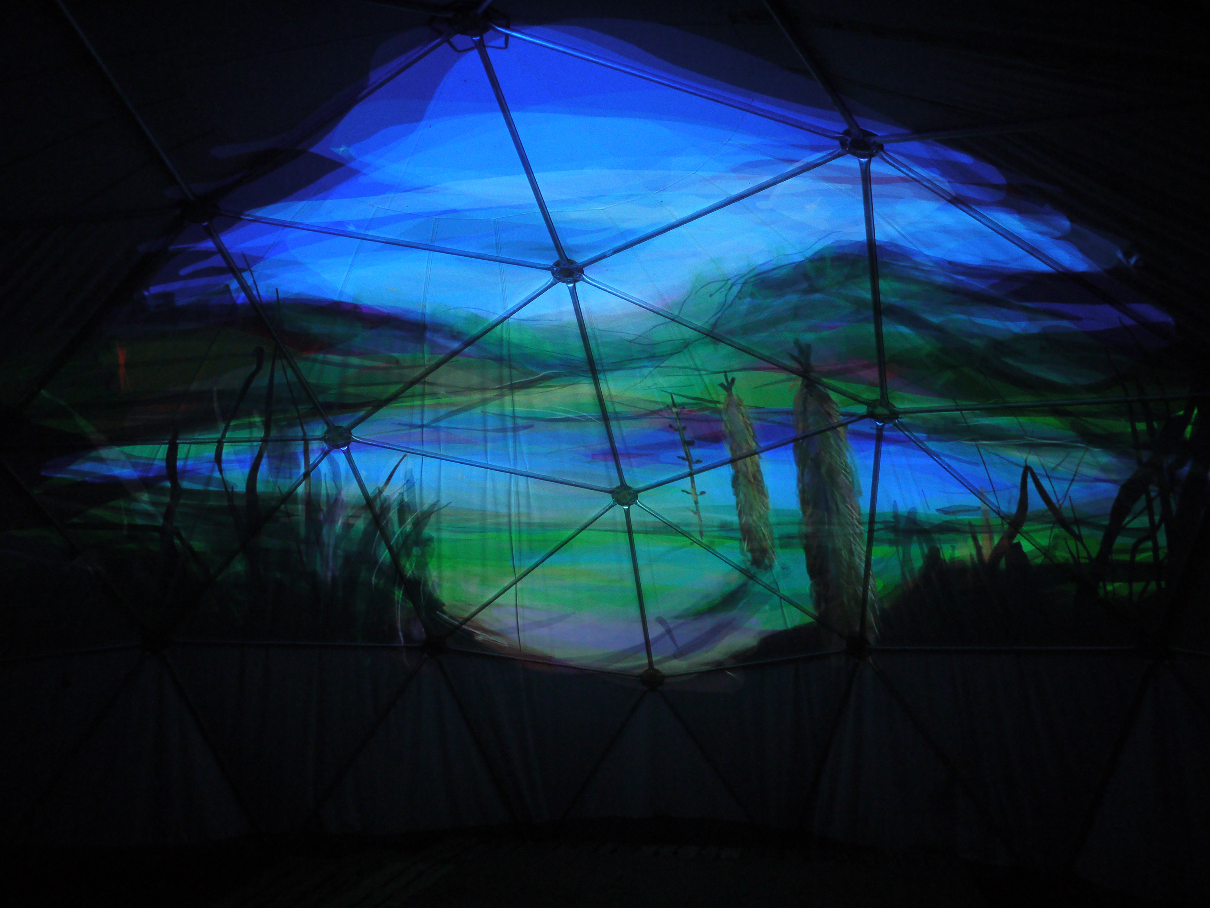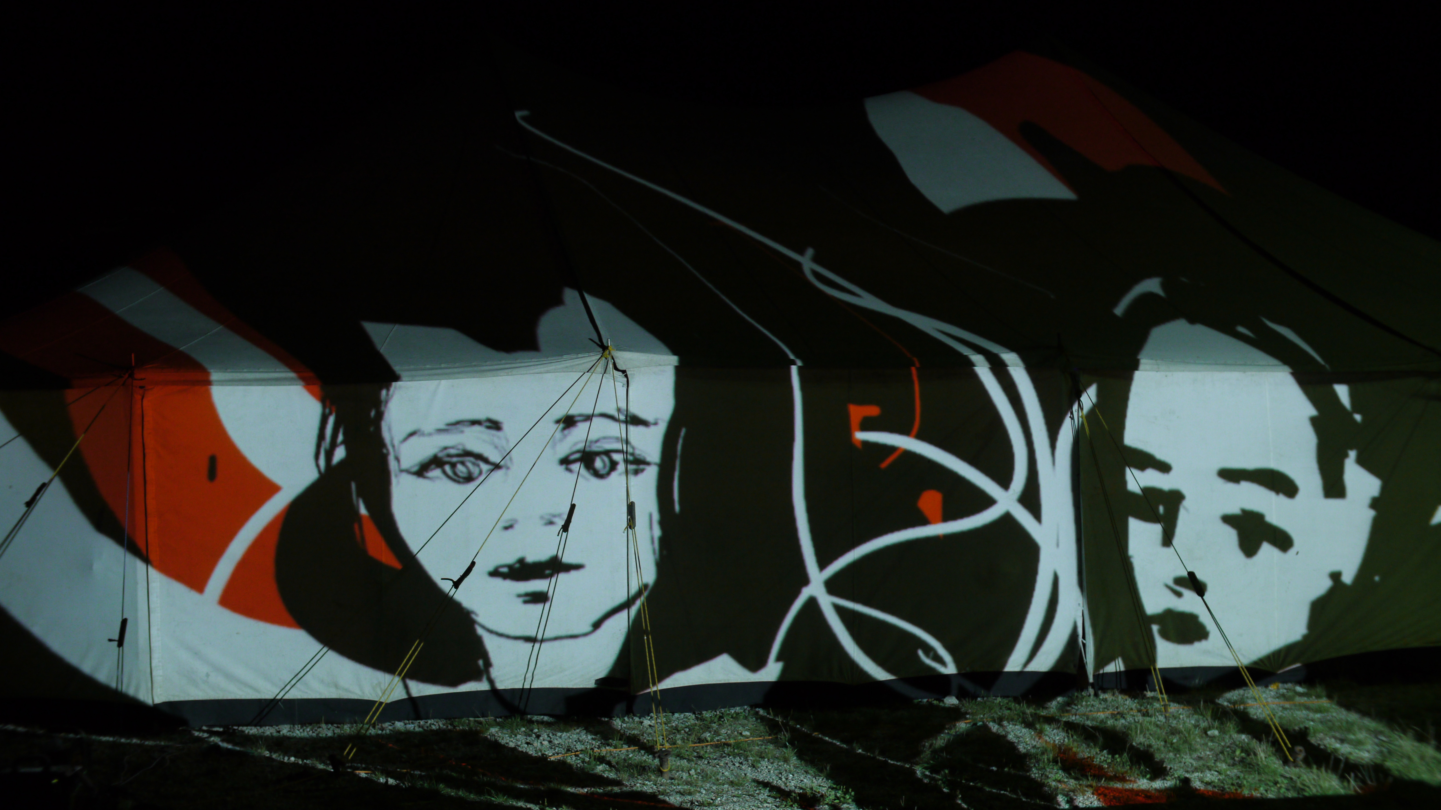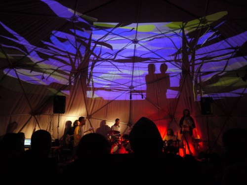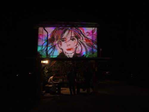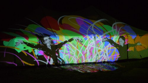 …the two above showing the outside/inside view of the same drawing. When we set up the projector we found that from inside the drawings could only be seen on the vertical wall of the tent, an accidental happening that made it look like the images were precisely mapped – nice!