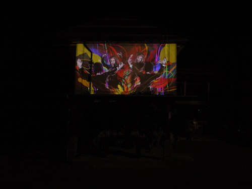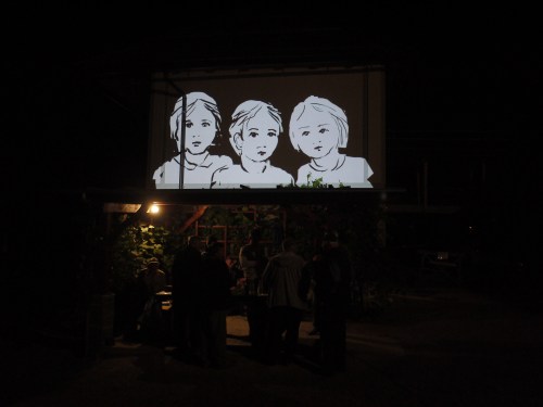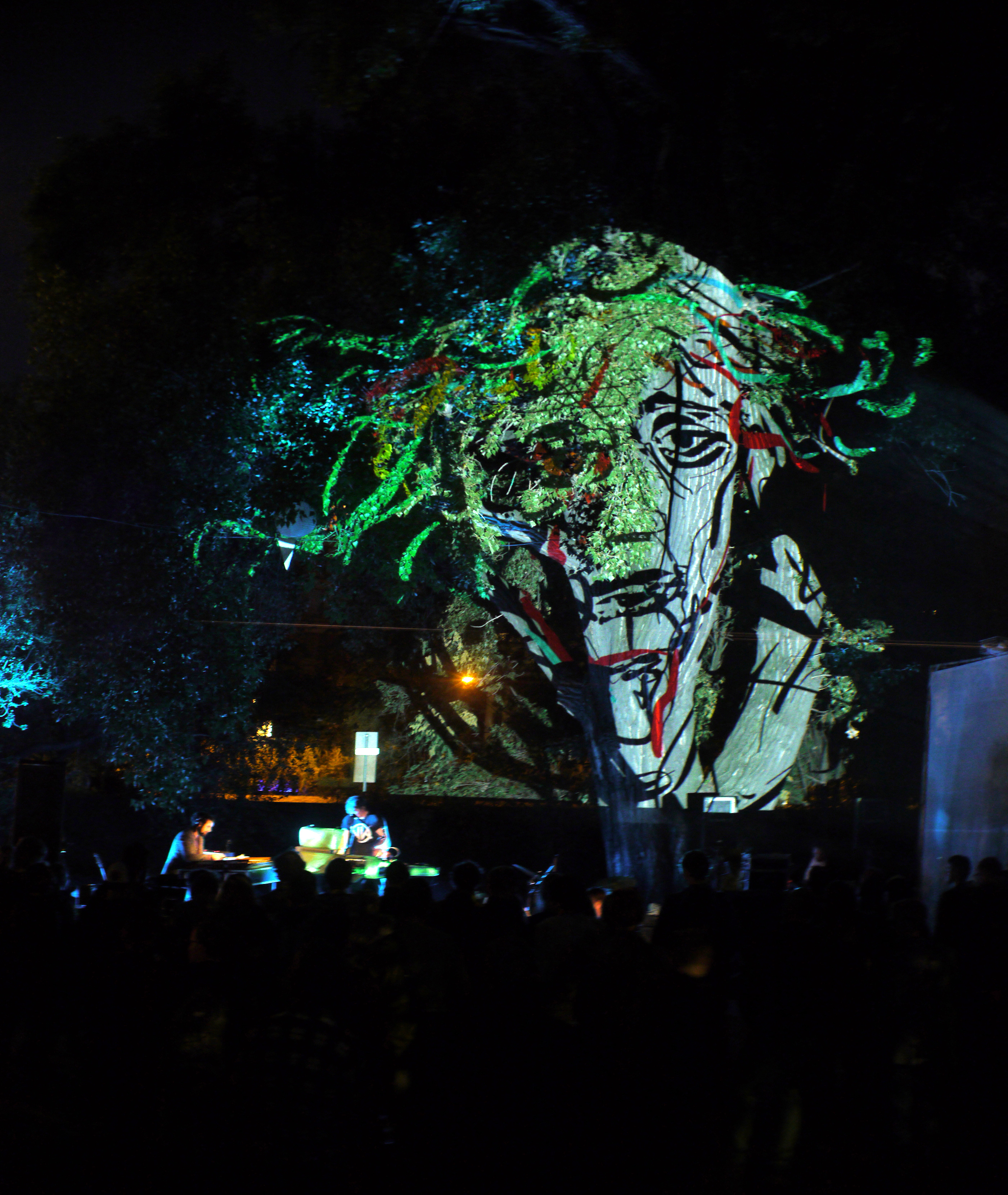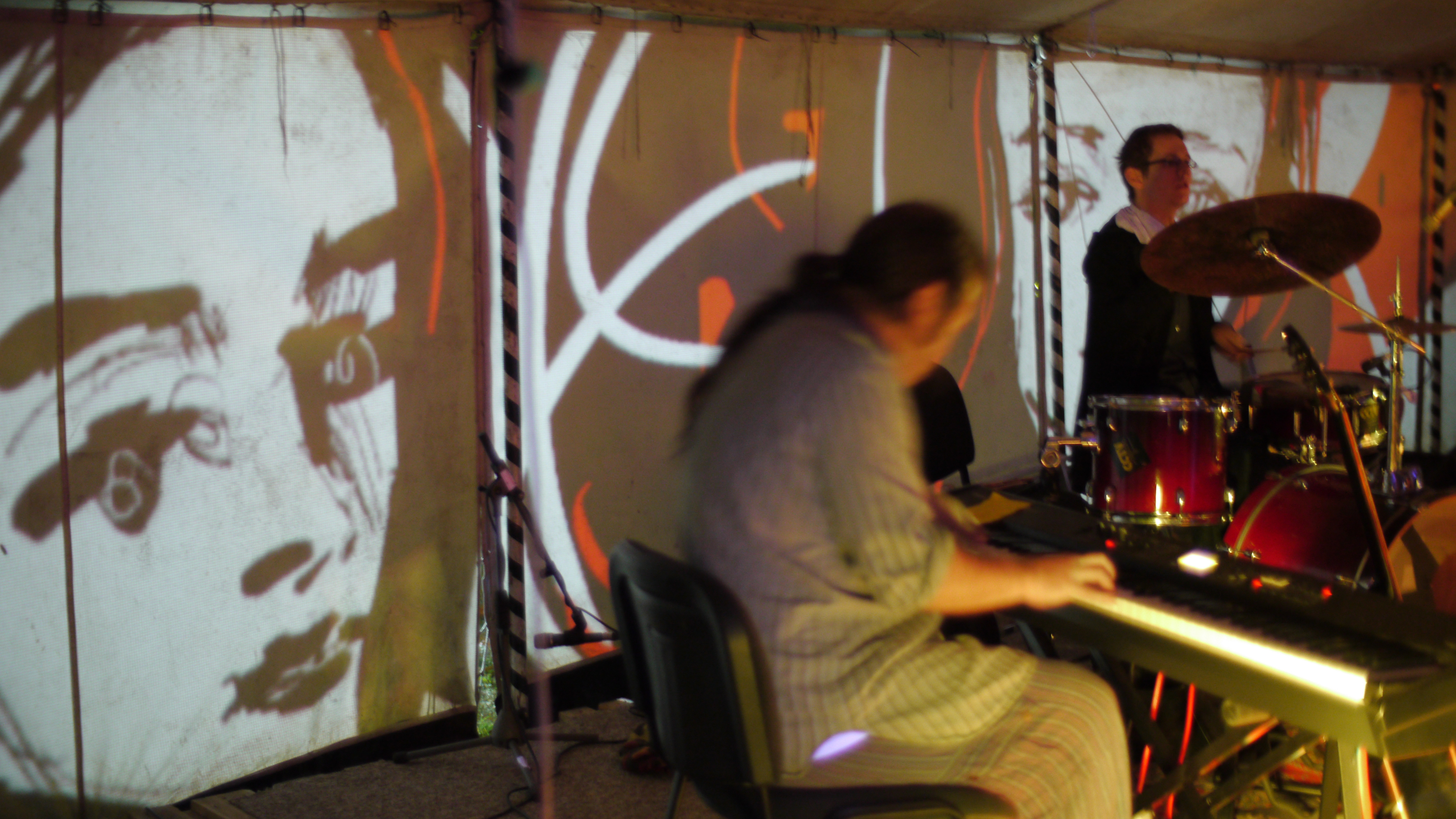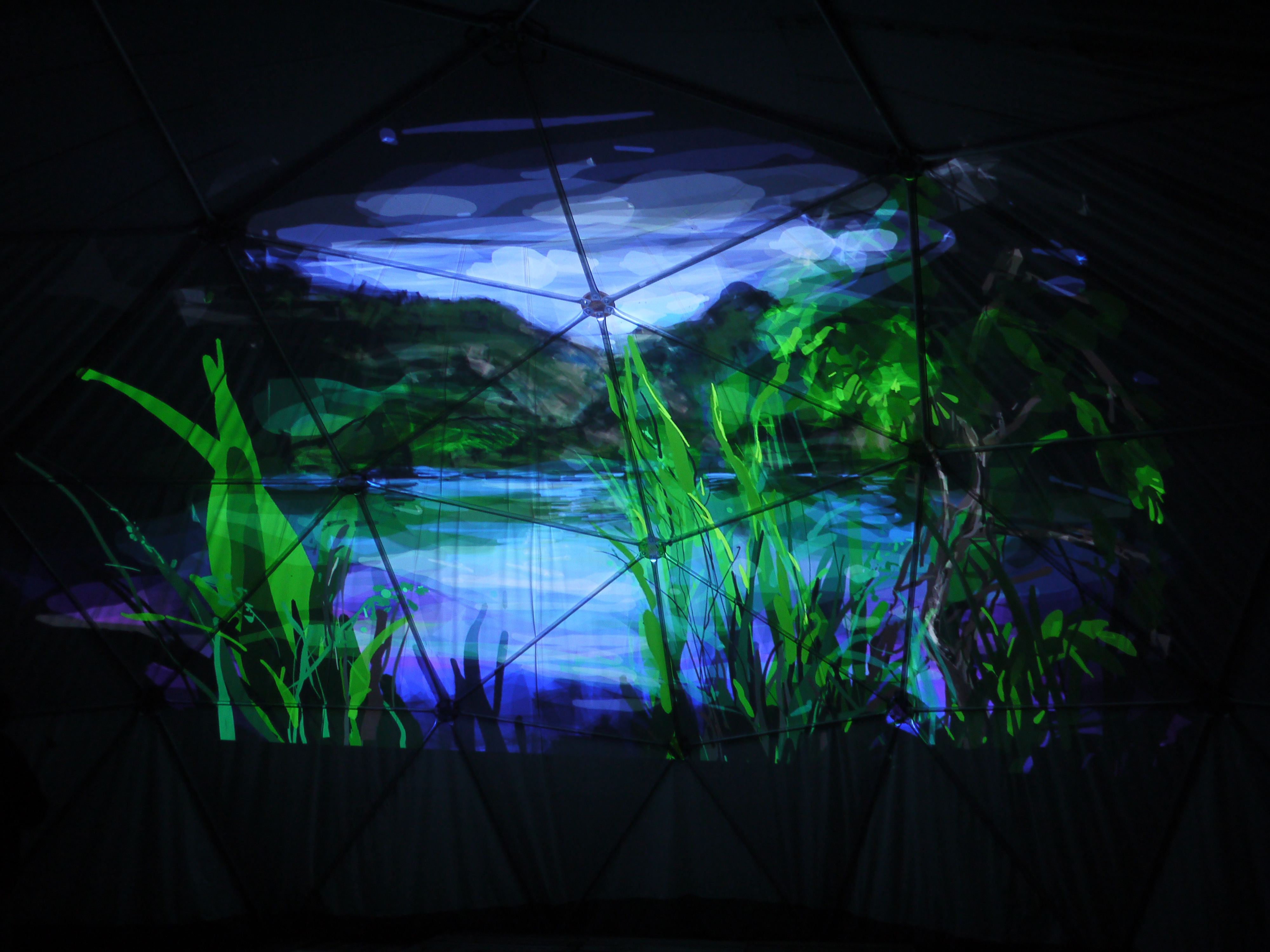…the two above showing the outside/inside view of the same drawing. When we set up the projector we found that from inside the drawings could only be seen on the vertical wall of the tent, an accidental happening that made it look like the images were precisely mapped – nice!