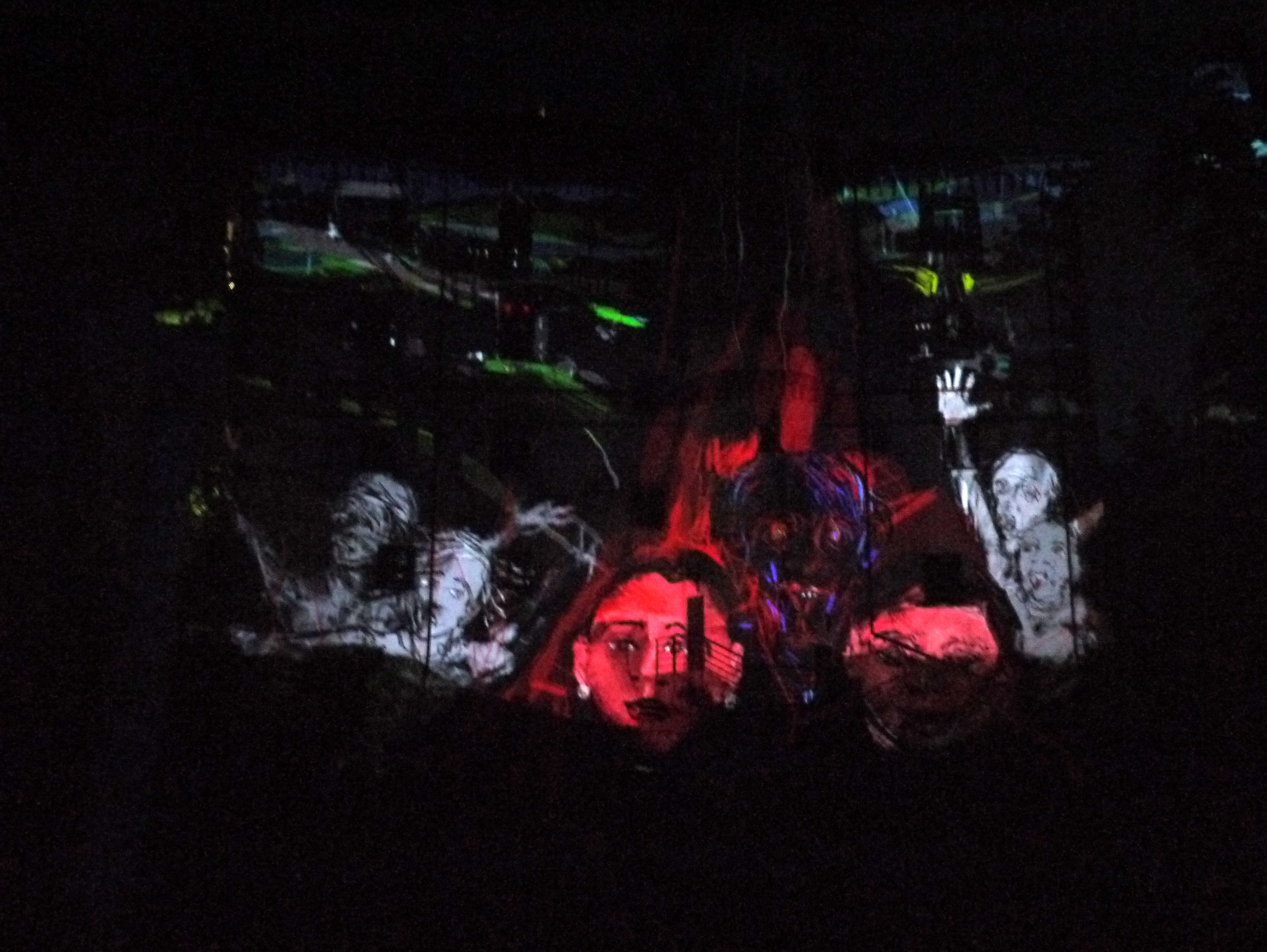 As it was not possible for me to see easily all of what I was drawing behind the performers I decided to keep things simple – a frieze of bright colours, some big heads and silhouettes…and below here are some of Dima’s photos.