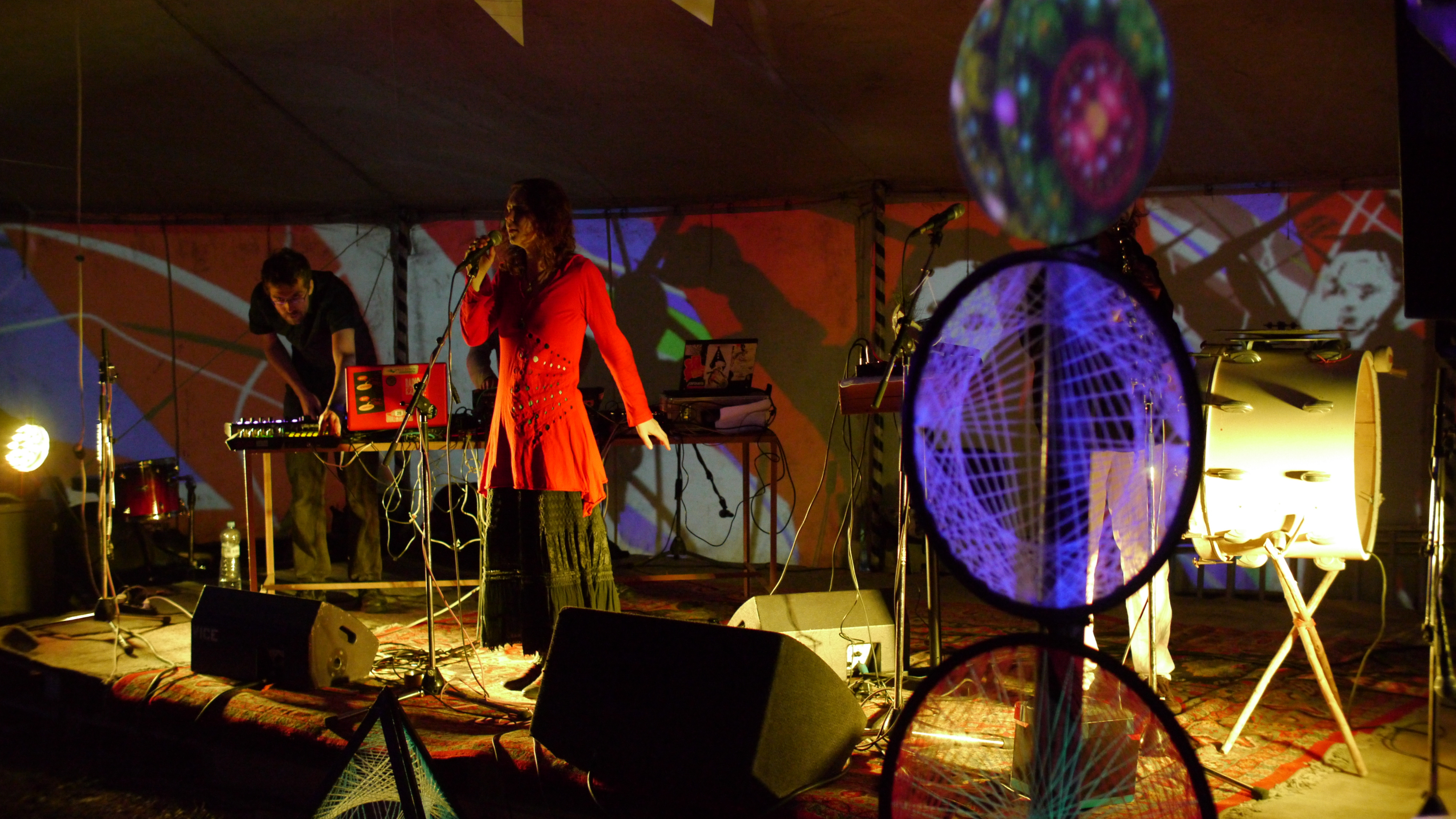 Because there were already a lot of stage decorations, projections and lighting in front of the stage, projecting from inside the tent was not an option. But our big Epson projector easily shone through the canvas so we mounted it behind the tent inside the van and my Tagtool was connected via a long cable to the tent.